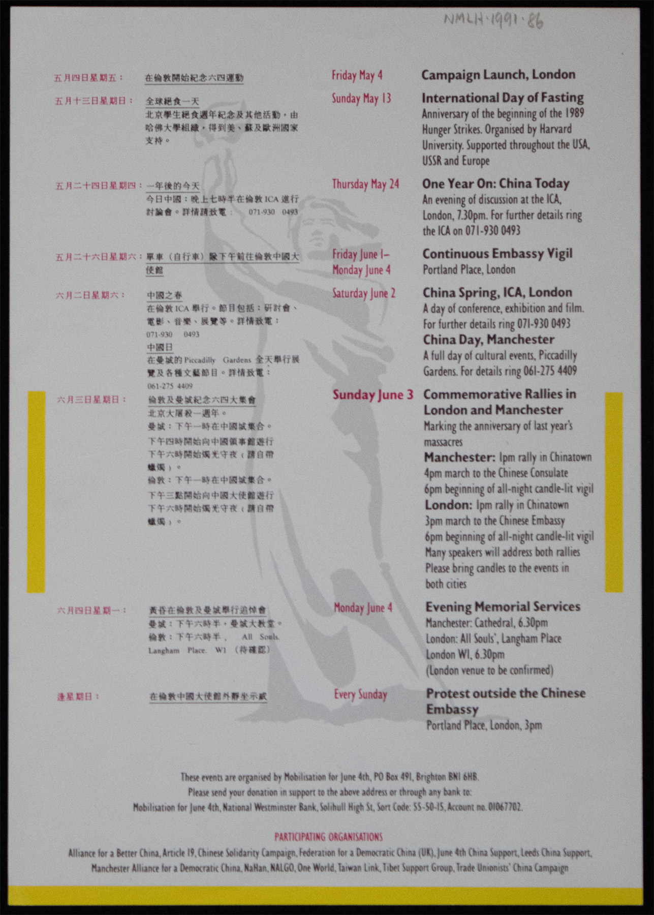 Red and yellow bilingual leaflet advertising a programme of events in London and Manchester to mark the one-year anniversary of the Tiananmen Square Massacre in China in 1989.