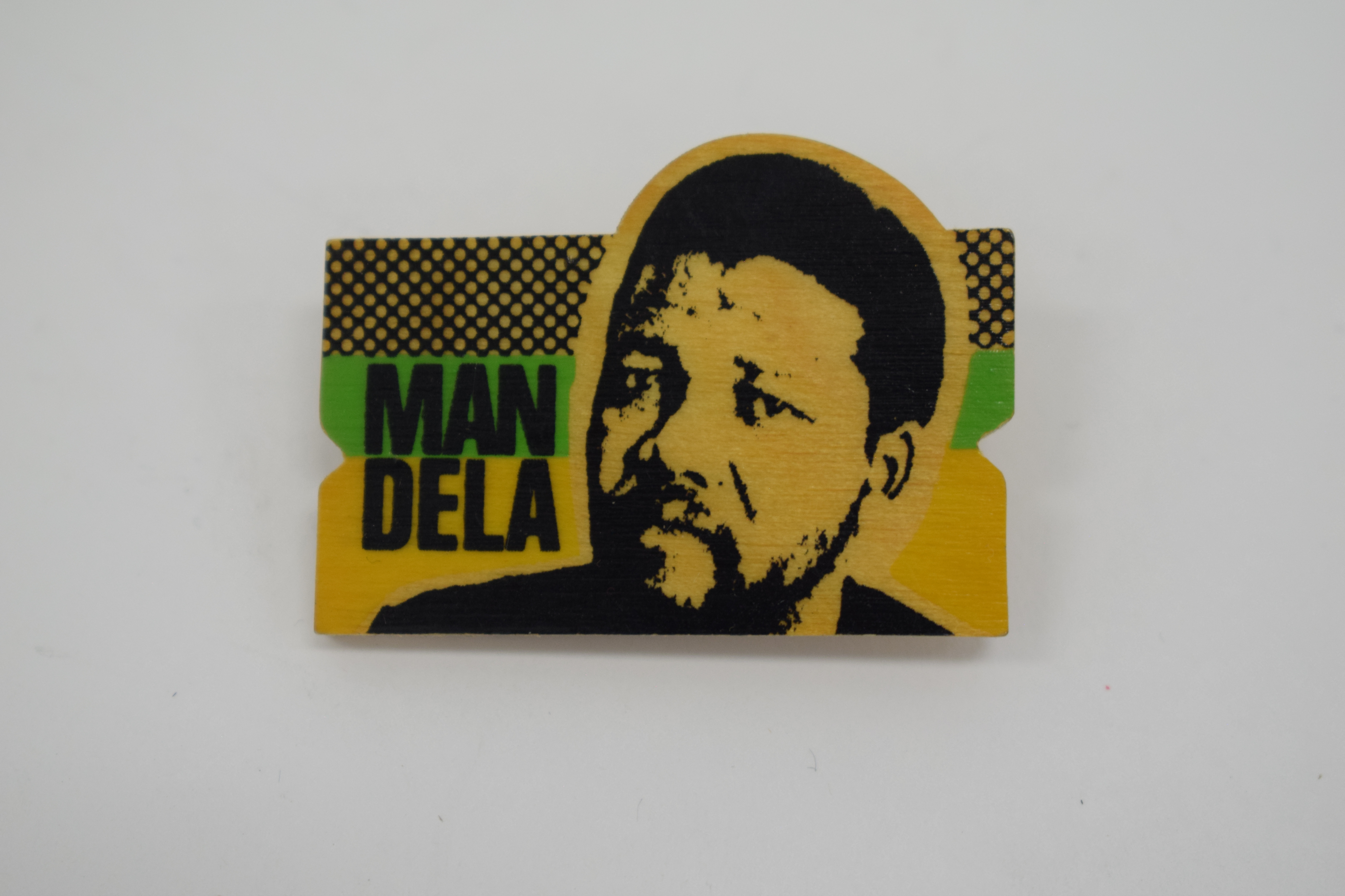 Wooden pin badge with a silhouette portrait of Nelson Mandela beside "MANDELA" in black on green and yellow horizontal striped background.