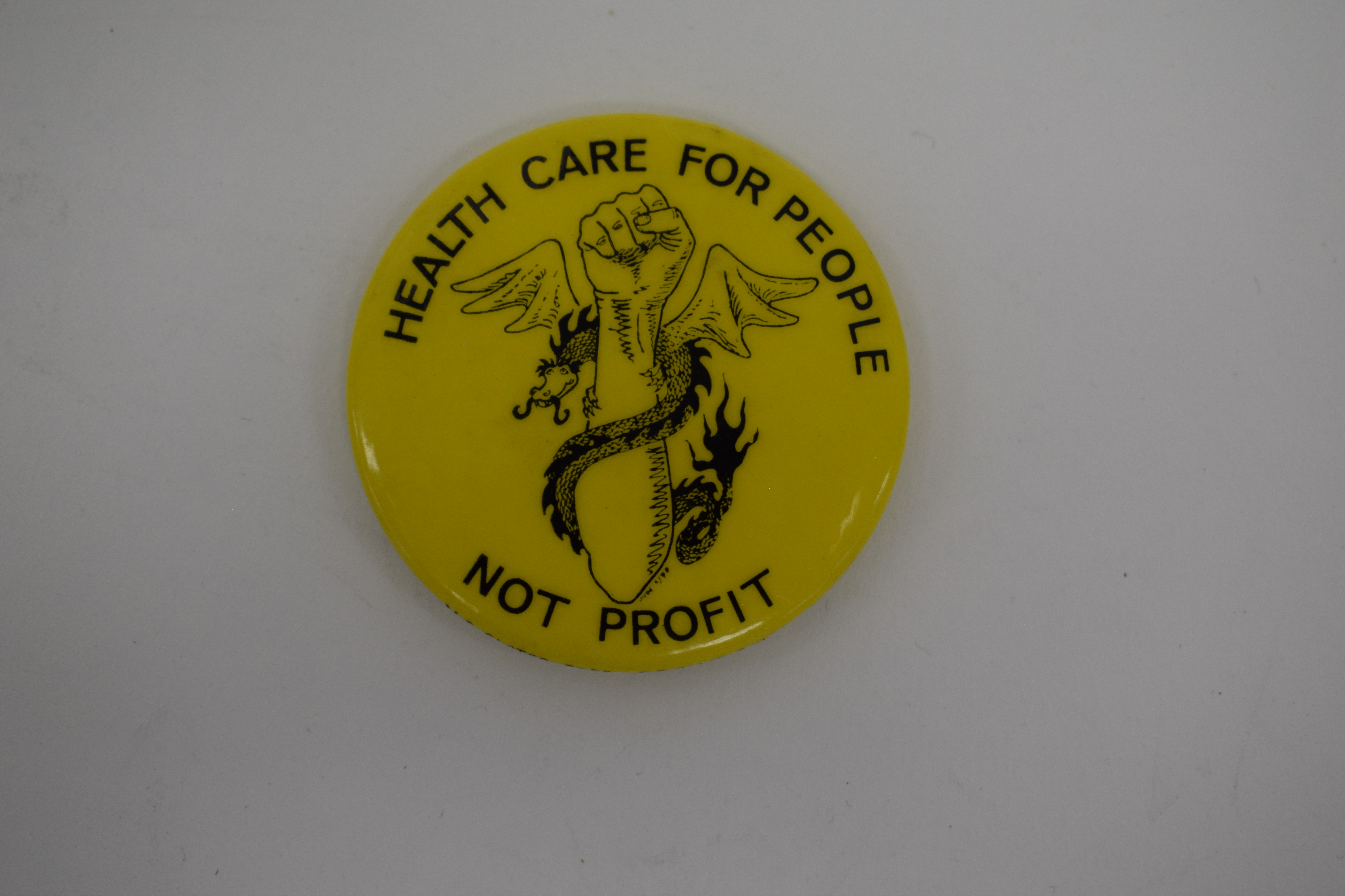 Circular yellow badge, "Health Care For People Not Profit" around an image of a raised fist with two snakes coiled around it and wings at the top, similar to a caduceus (a staff with two snakes coiled around it, a symbol associated with healthcare).