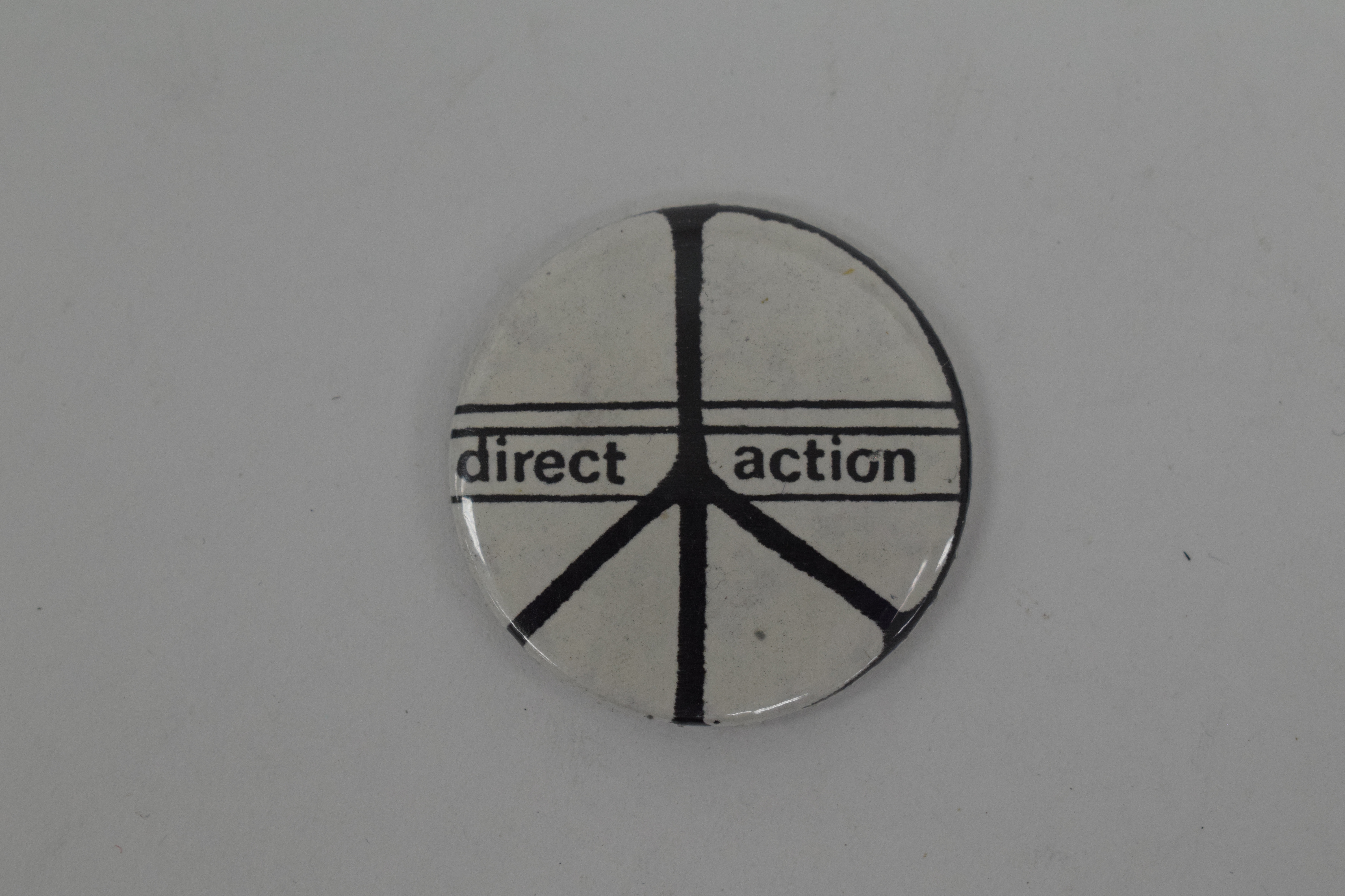 White round badge, "direct action" in black overlaid on a peace symbol, the logo of Campaign for Nuclear Disarmament (CND).