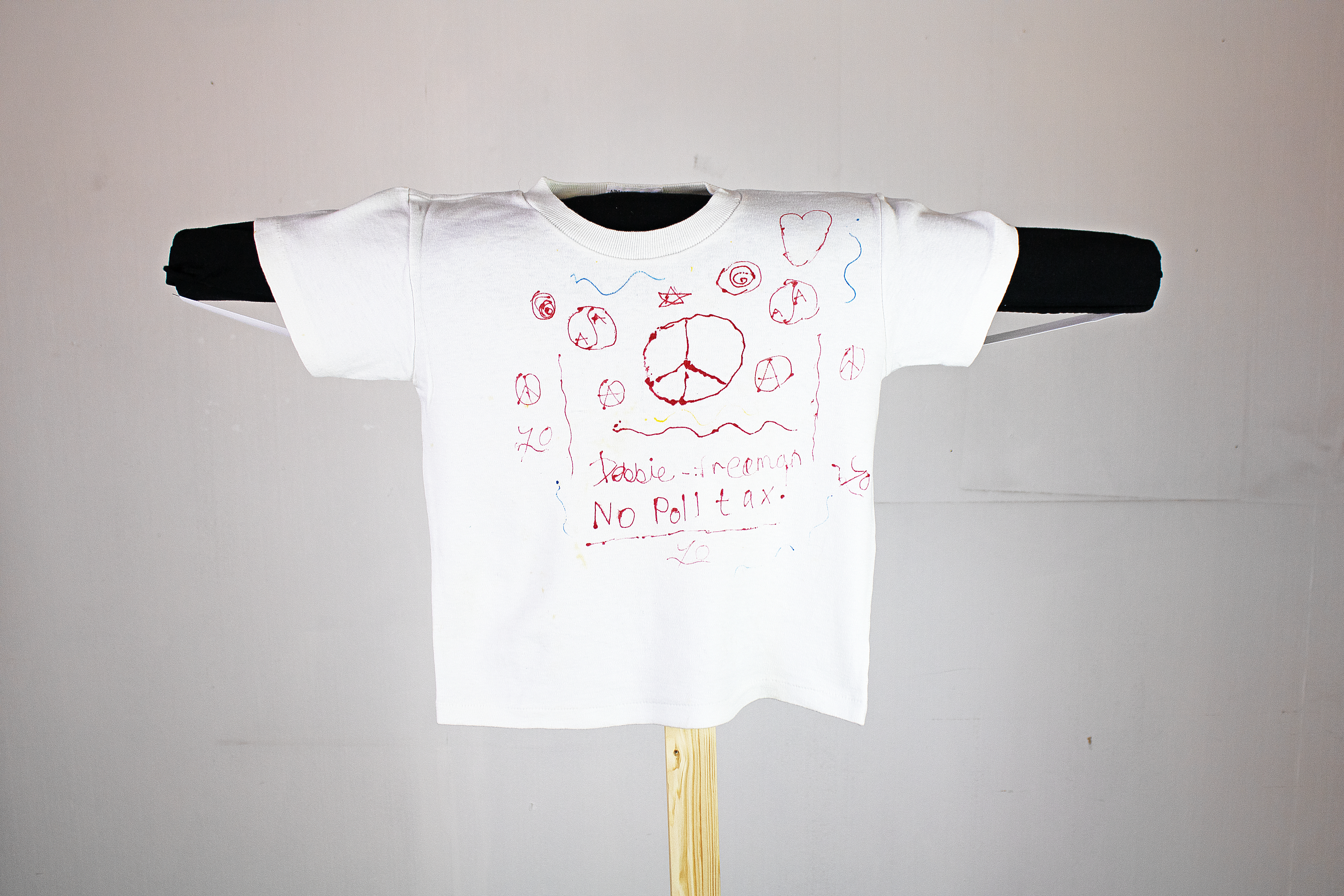 A white t-shirt featuring hand-drawn peace signs and text reading "Debbie Freeman No Poll tax!"