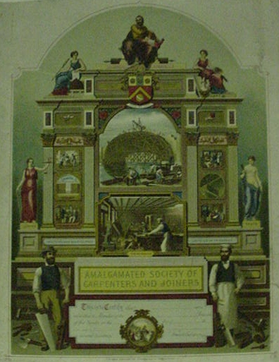 The Amalgamated Society Of Carpenters And Joiners, established in 1860, was a 'new model union': financially-secure, with a national office and paid secretary, a large membership, and an executive exercising substantial control. These factors and the range of benefits available to paid-up members are well represented in the images and panels of this emblem design. Emblems promoted the benefits of union membership well over a century before the Welfare state was established.