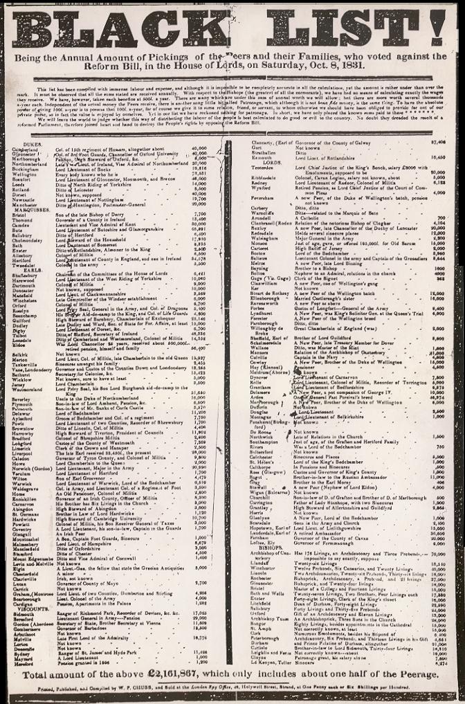 BLACK LIST ! BEING THE ANNUAL AMOUNT OF THE PEERS ..WHO VOTED AGAINST THE REFORM BILL...1831. Chubb Spy Office London