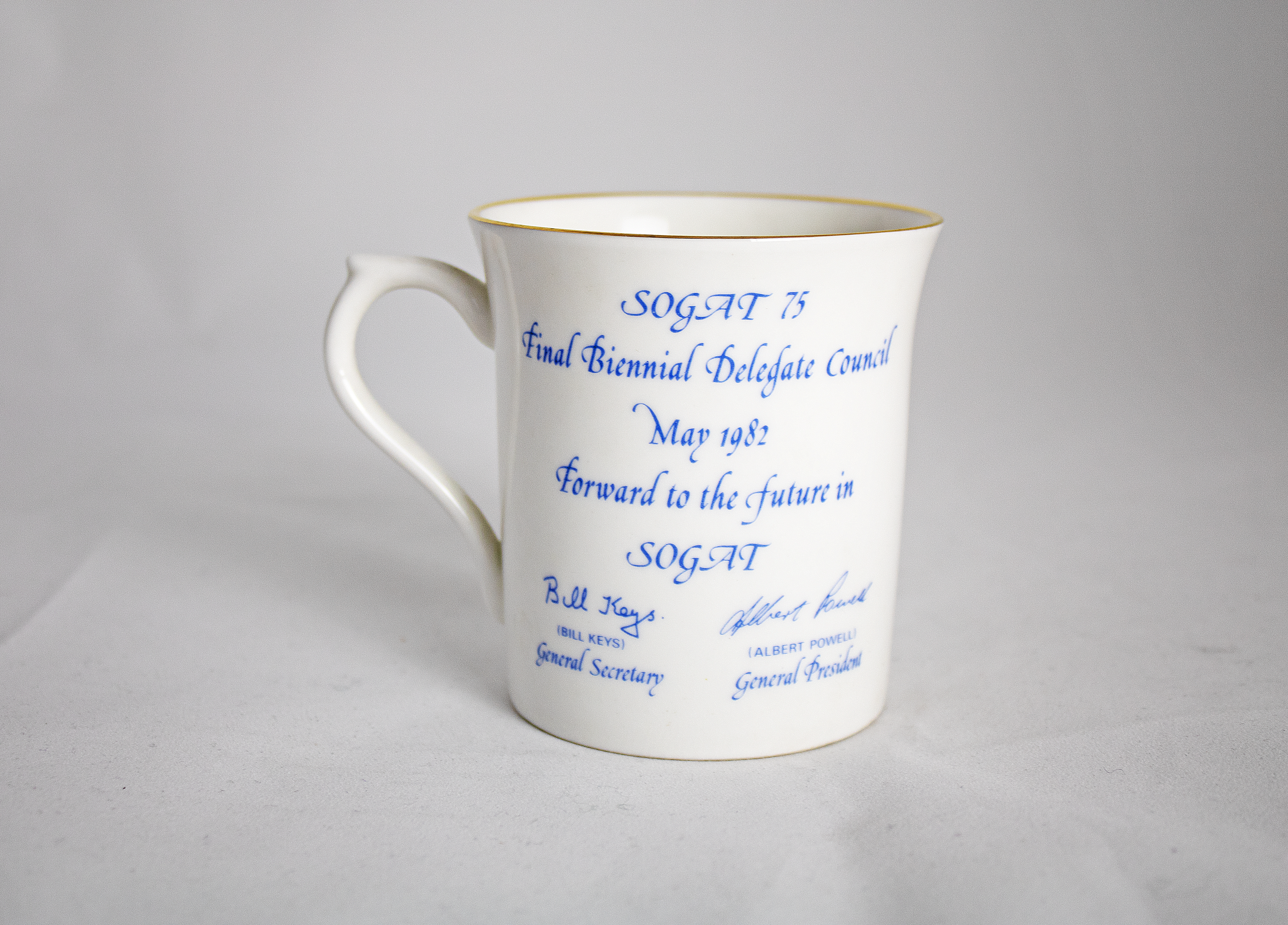A white mug with the Society of Graphical and Allied Trades (SOGAT) emblem reading: "SOGAT/SOGAT 75 FINAL BIENNIAL DELEGATE COUNCIL. MAY 1982 FORWARD TO THE FUTURE IN SOGAT ....."