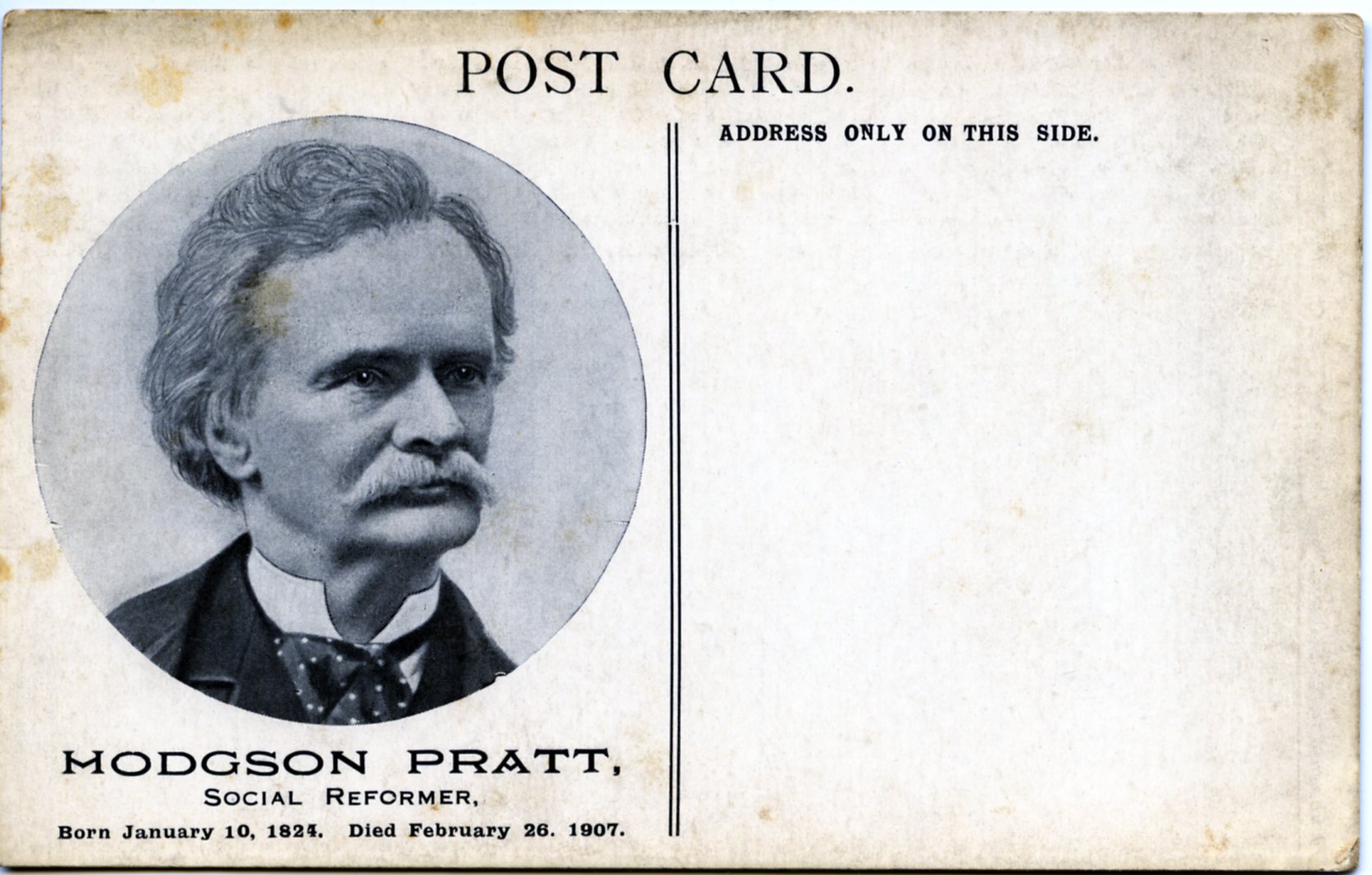 "Hodgson Pratt, Social Reformer. Born January 10,1824. Died February 26 1907, postcard" [NMLH.2014.26.1.32]