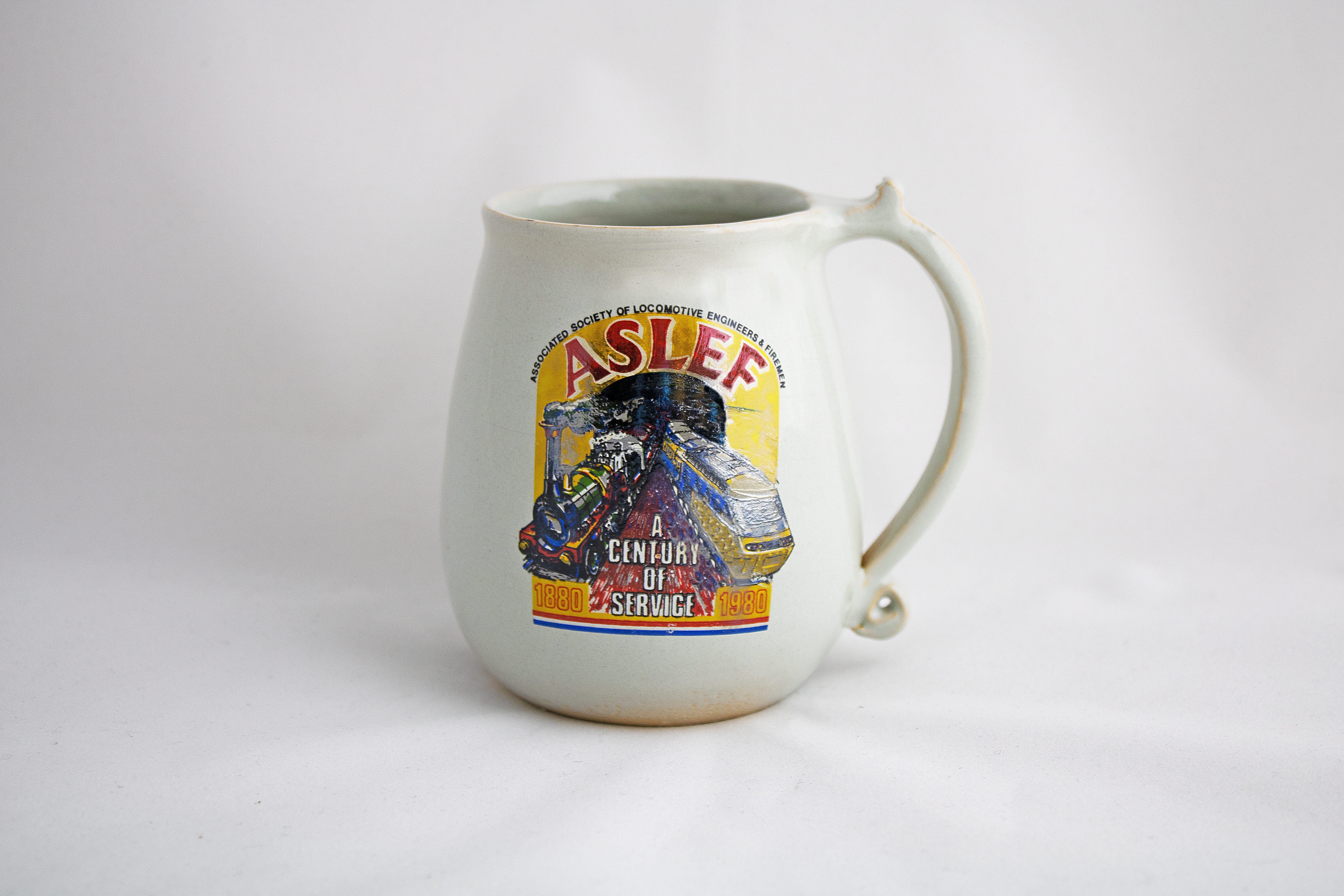 A ceramic mug commemorating a century of service from the Amalgamated Society of Locomotive Engineers and Firemen (ASLEF), featuring an illustration of two trains, one old and one more modern.