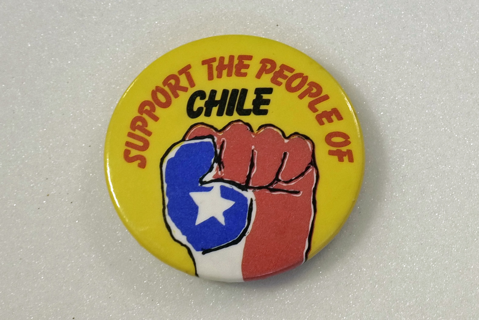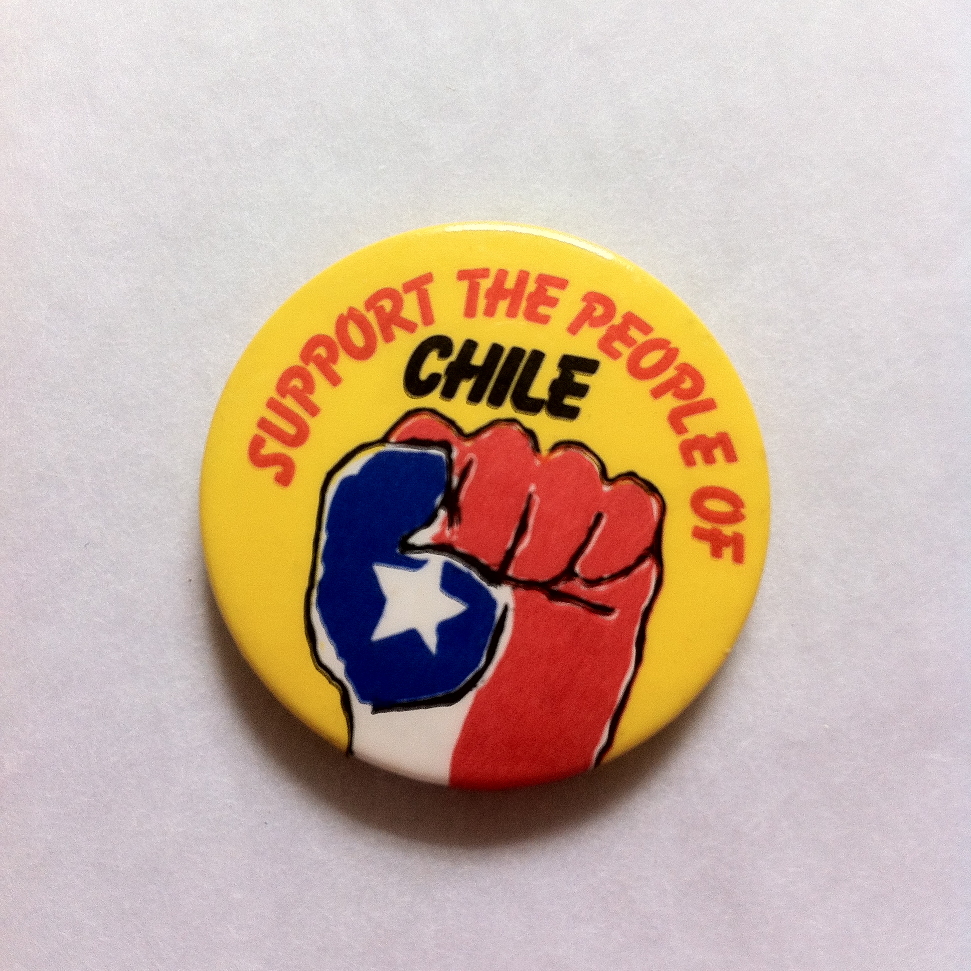 Round yellow badge with a raised fist in red, white and blue, the colours of the Chilean national flag, and with the white star on blue as featured on the flag. Text above in red and black reads "Support the people of Chile".