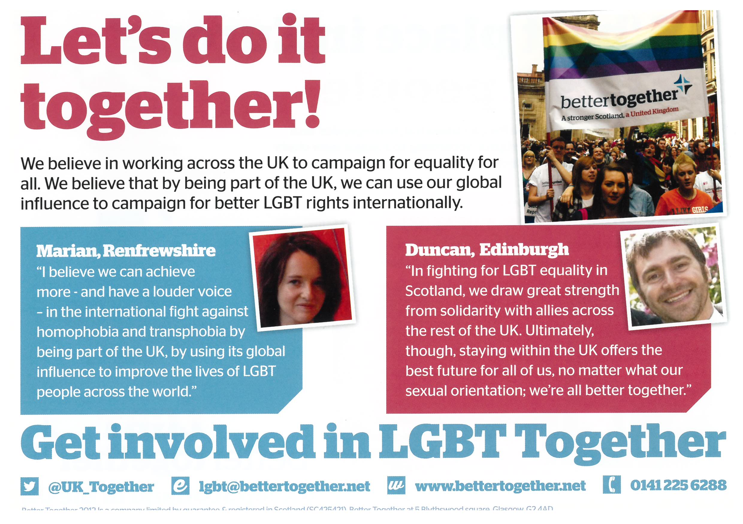 A doubel sided flyer for the 'Better Together' campaign, arguing against Scottish devolution from the UK. This flyer specifically targets the LGBT community, stating that the struggle for international LGBT rights is better fought by the UK rather than independent states.