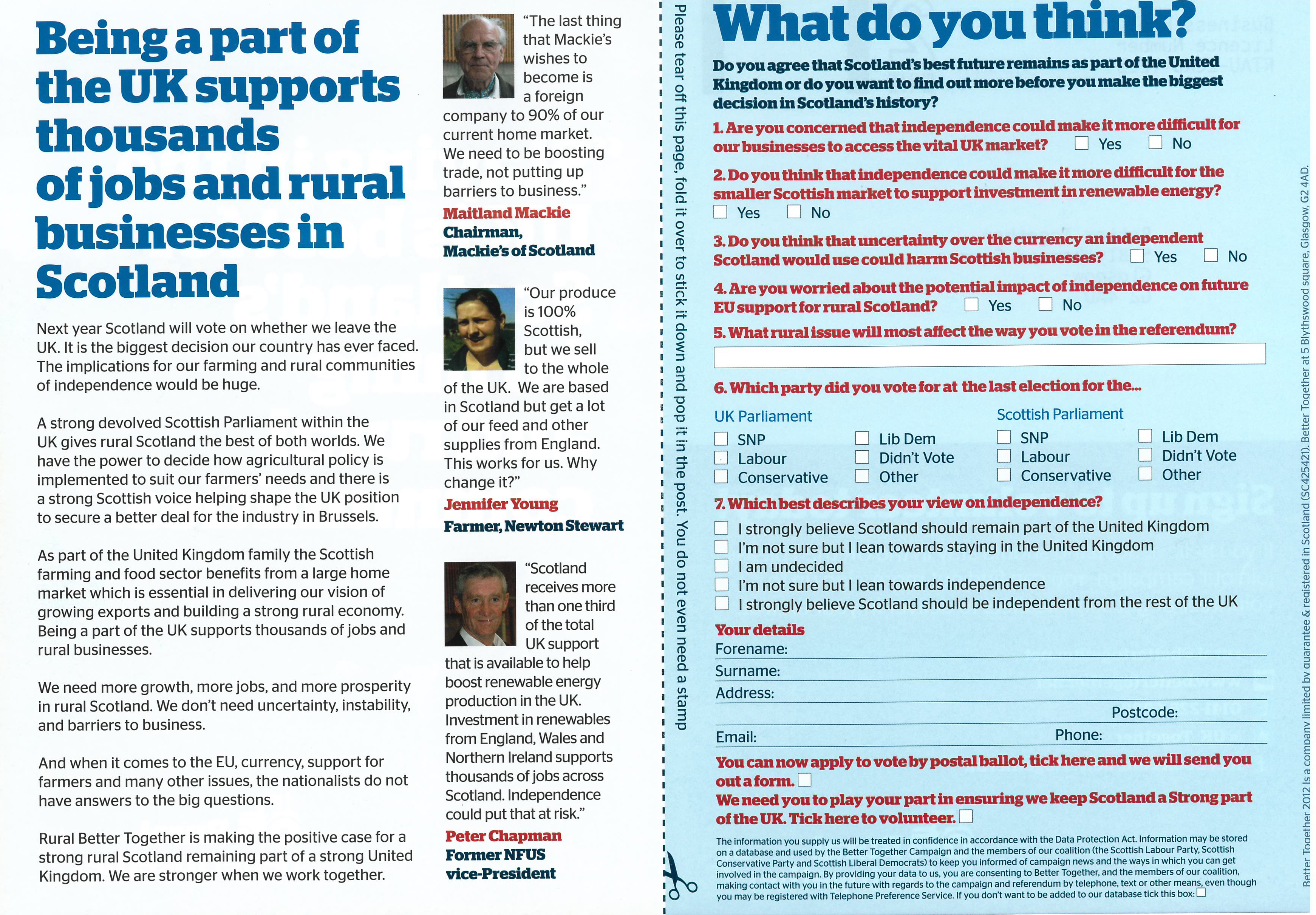 The back page of the pamphlet contains a survey on voting attitudes in the upcoming referendum, to be sent freepost to the Better Together HQ in Glasgow. It was produced in 2013, a year int he run up to the referendum to be held in September 2014.