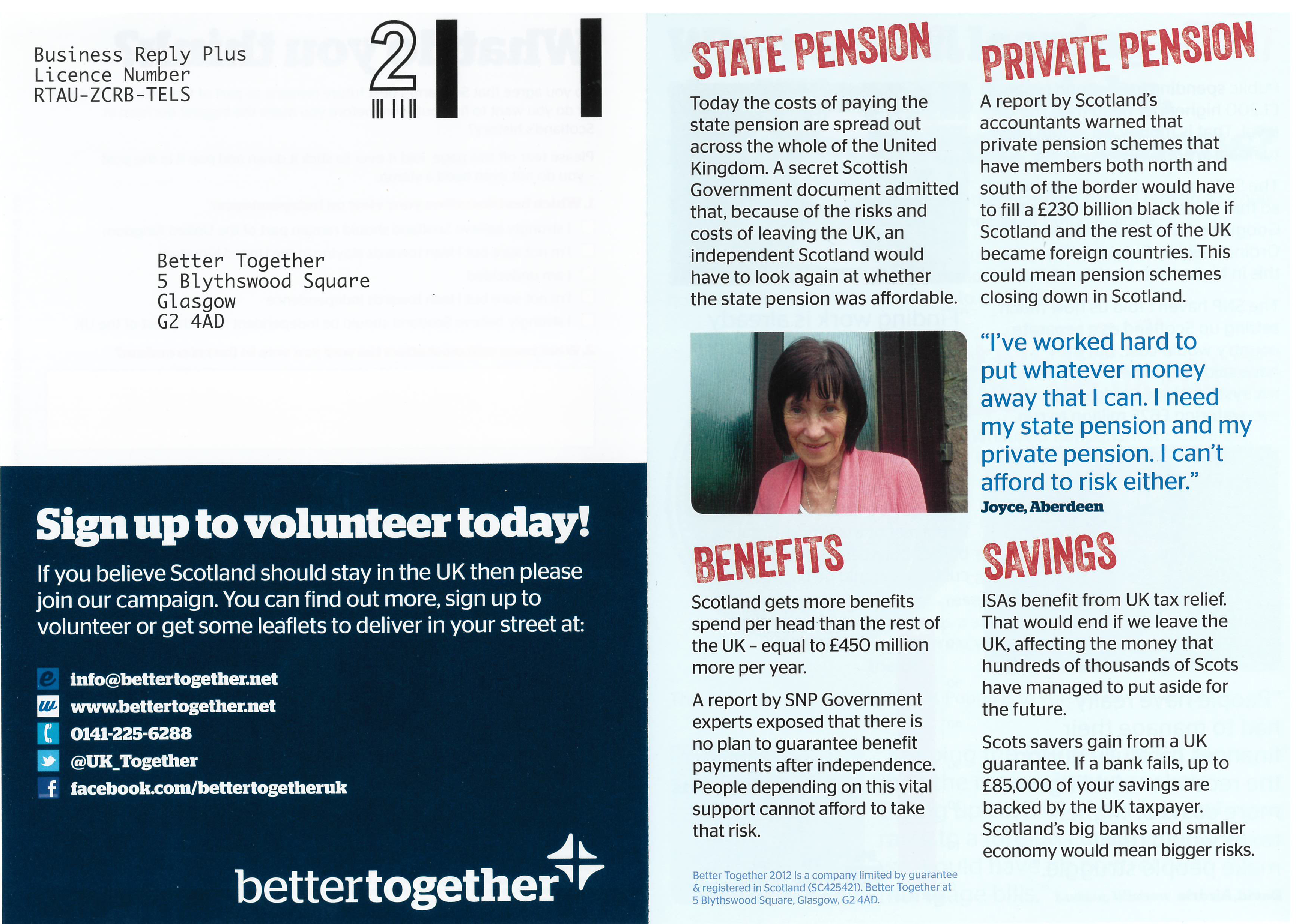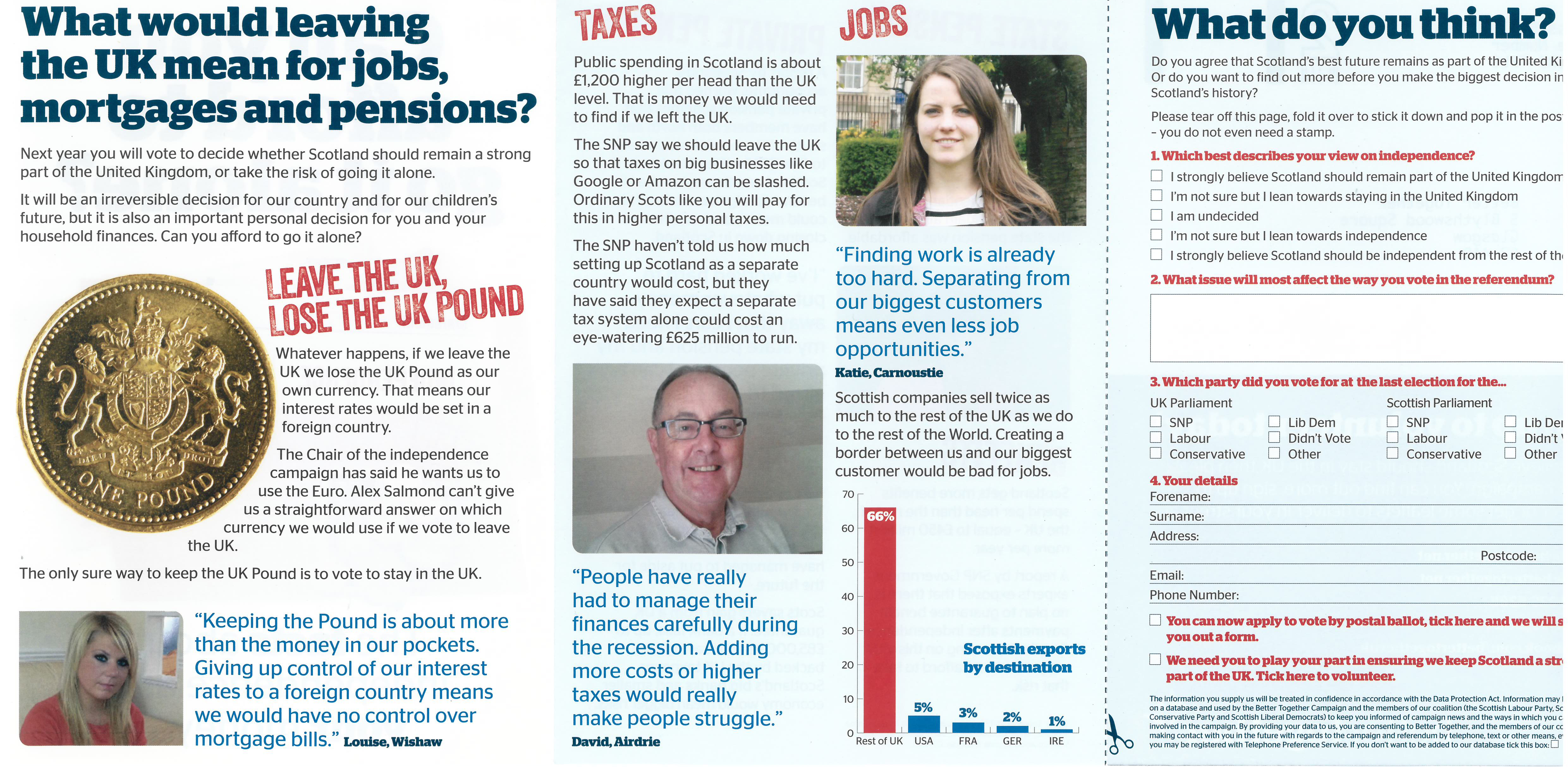 The pamphlet argues that Socttish indpenedenc would have a negative effect on Scotland's weatlth, in terms of establishing a new currency, increasing taxes, cuts to pensions and benefits, and the loss of the rest of the UK as business customers. The last page of the pamphlet contains a survey of voting attitudes to the referendum to send back freepost to the Better Together HQ in Glasgow.