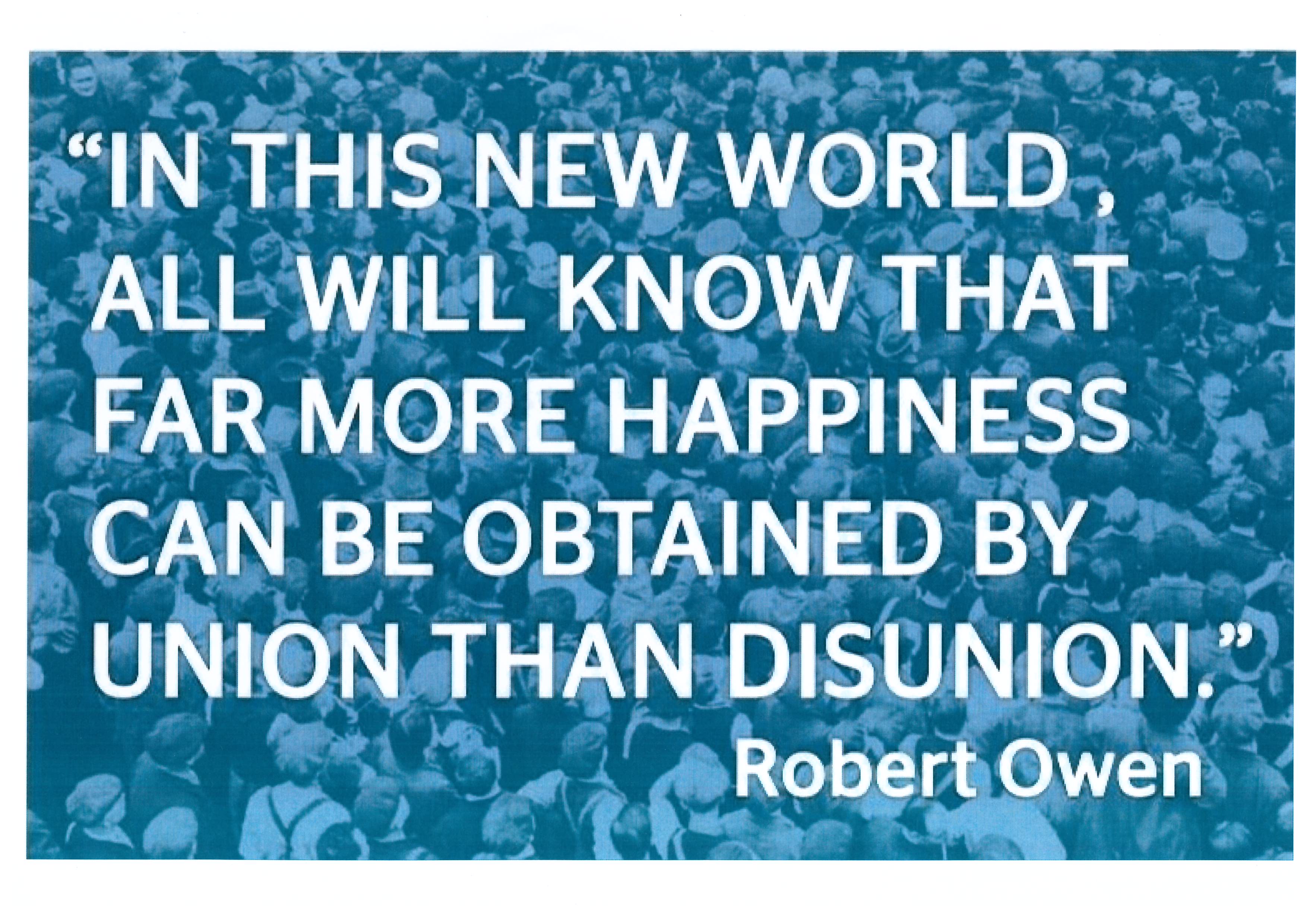 The background of the design is a blue tinted photograph of a crowd of working class men, approx. early 20thC. The text over the image reads: "'In this new world, all will know that far mroe happiness cna be obtained by union than disunion.' Robert Owen"