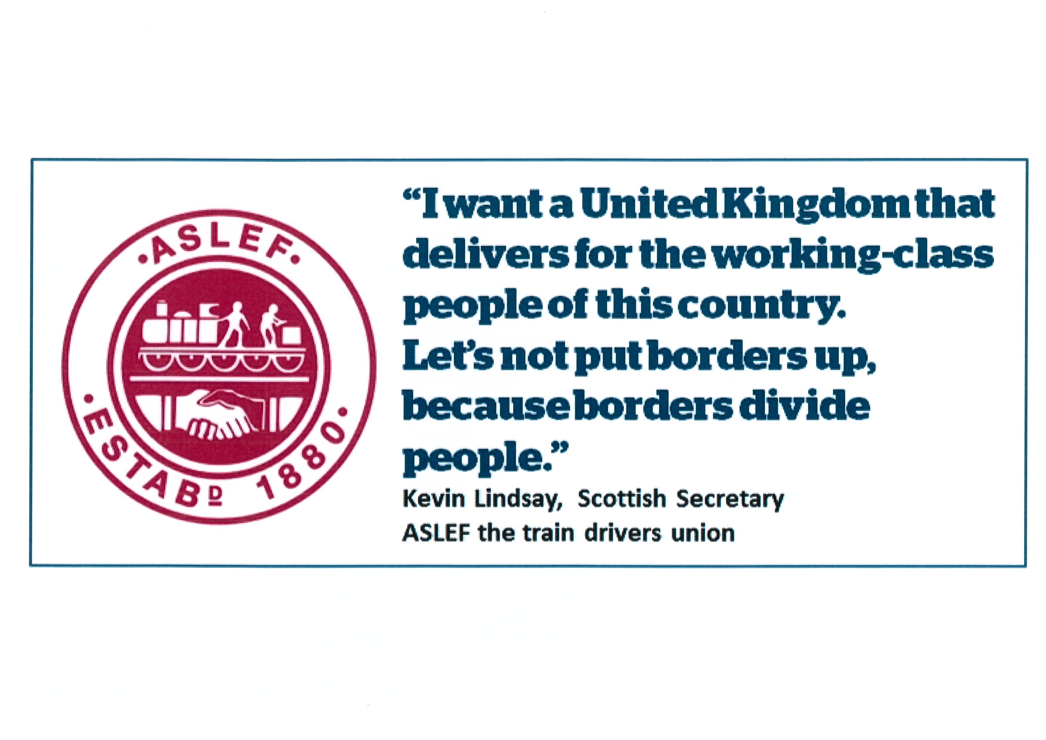This poster design features a cartoon of a transit crate with a bar chart explaining the value of exports to the UK and rest of the world. The text above the picture reads: "Scottish business export twice as much to the rest of the United Kingdom as to the rest of the World."This poster design features the logo of ASLEF, with a quote from Kevin Lindsay, the Scottish secretary of the union: "I wwant a United Kingdom that delivers for the working-class people of this country. let's not pur borders up, because borders divide people."
