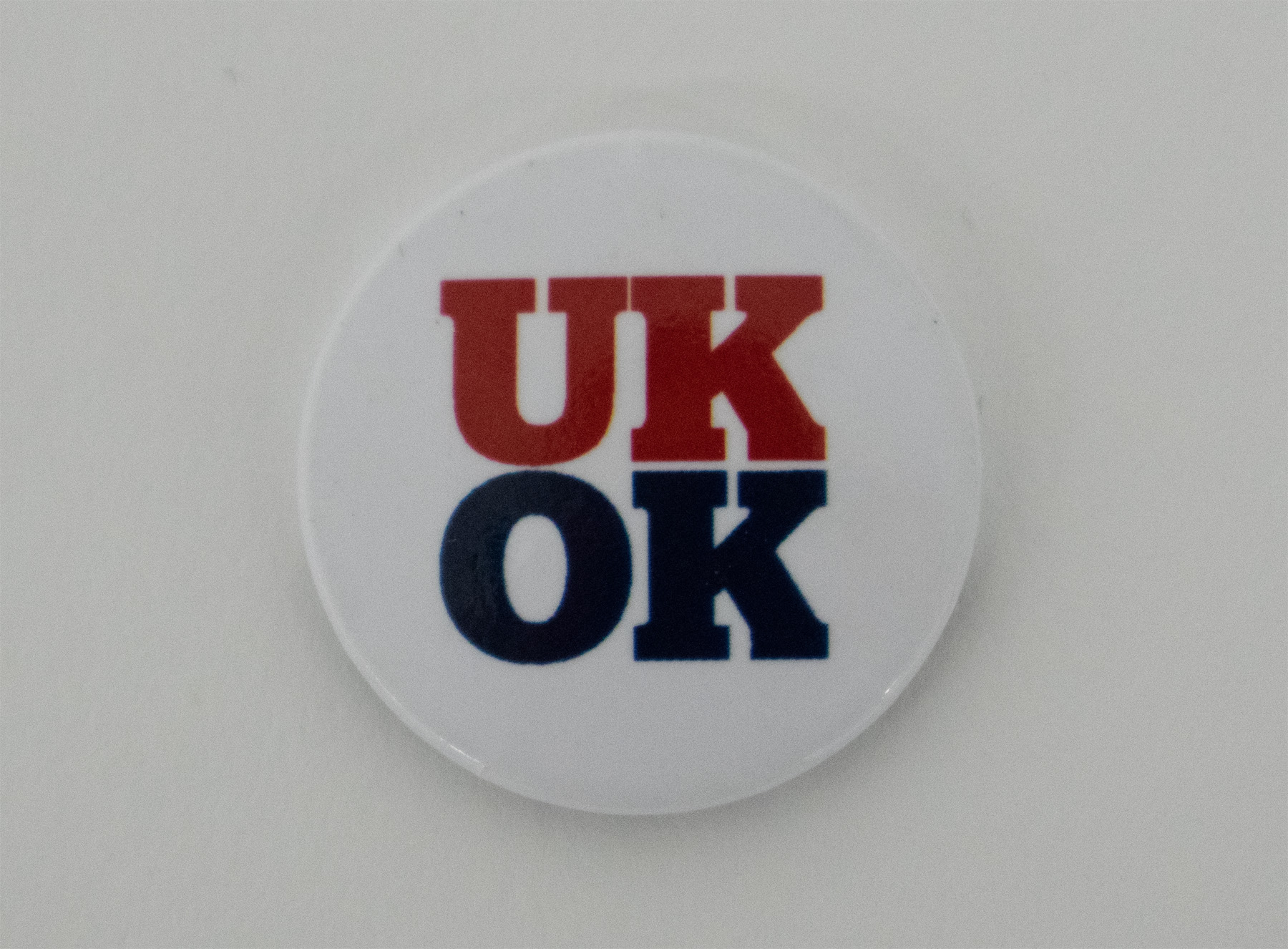 Round white badge, "UK OK" with each word in red and black. This was produced for the 'Better Together' campaign in 2013, arguing against Scottish separation from the UK in the upcoming referendum on Scottish independence in September 2014.