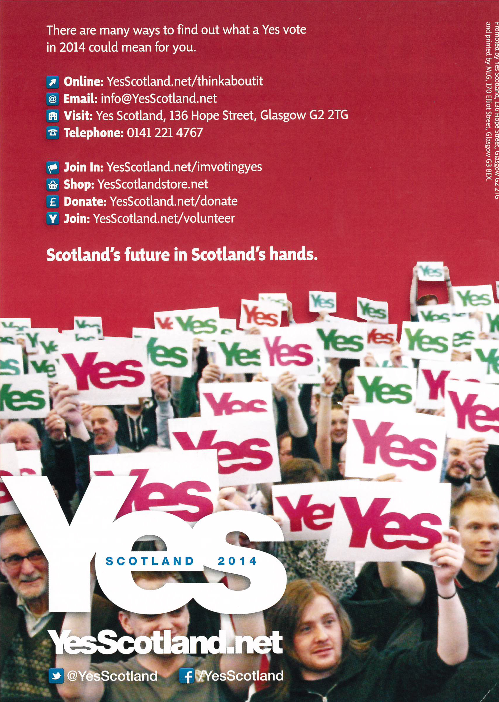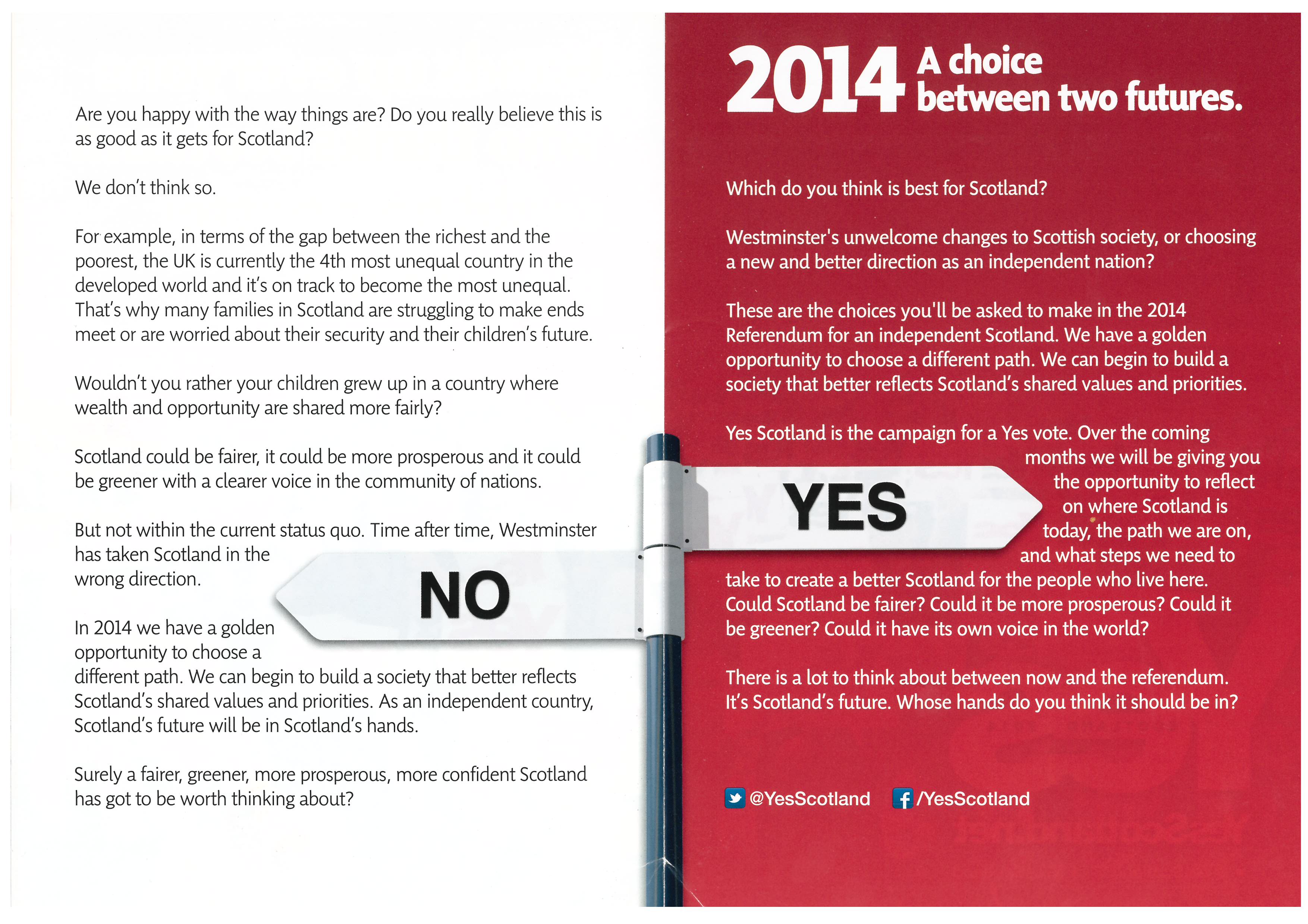 A leaflet created for the Yes Campaign, arguing for Scottish separating from the UK in the upcoming referendum on Scottish independence in September 2014.