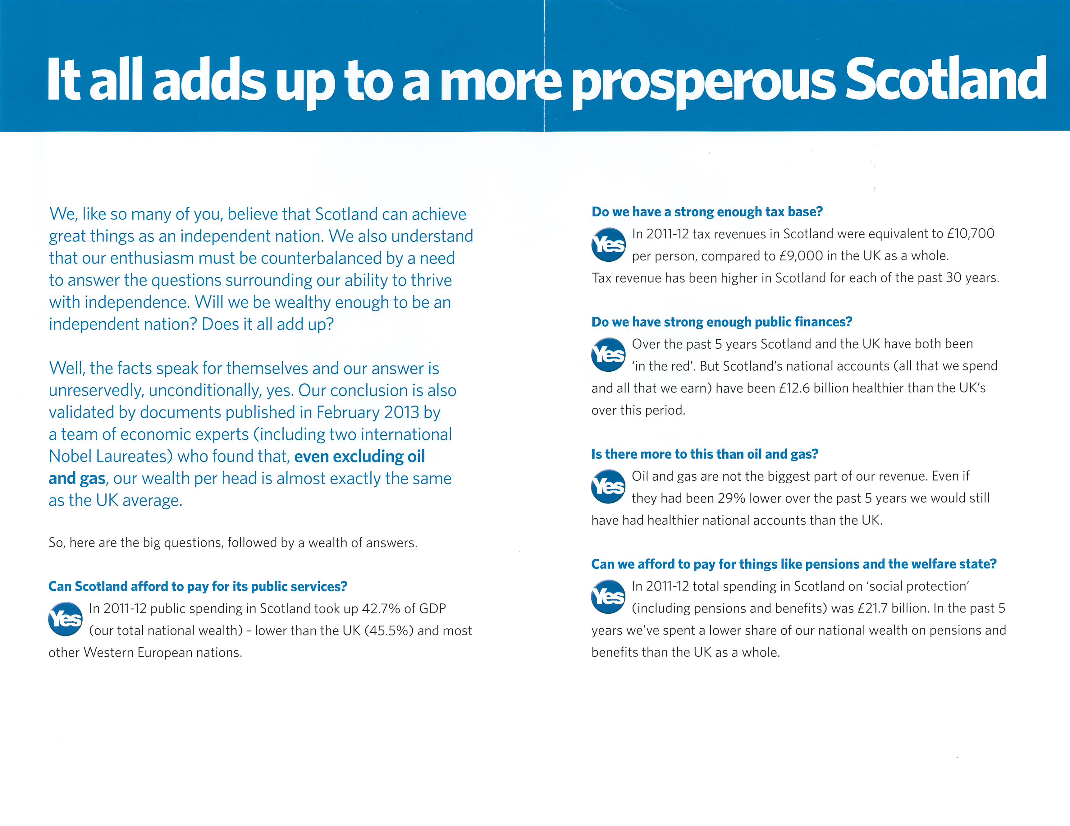 Inside leaflet argues that Scotland can afford to become independent, and that doing so would increase Scotland's wealth.