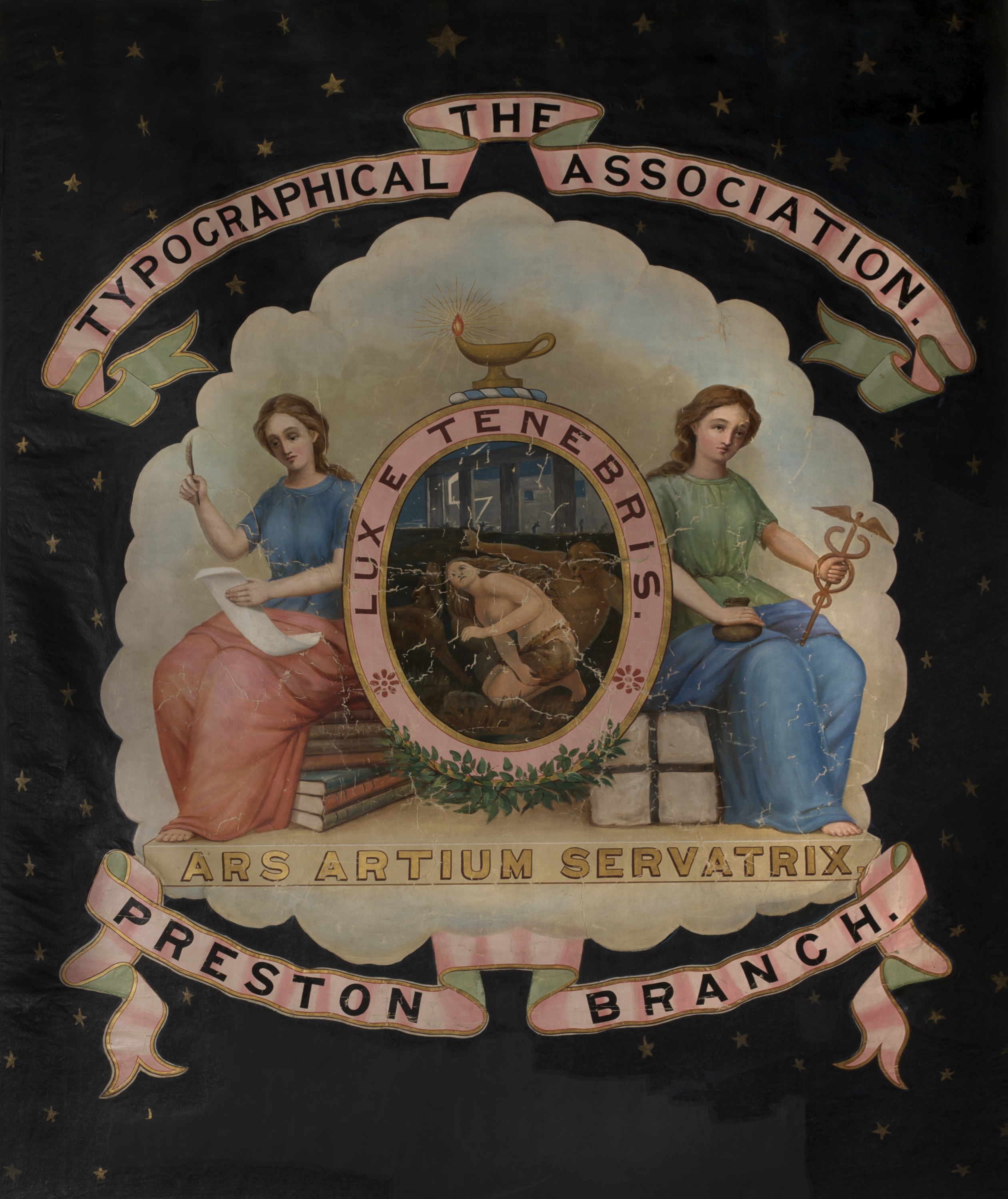 The central image is painted onto a cloud shaped background and shows two seated women. The woman on the left is seated on a stack of books, holding a piece of paper and a quill representing Knowledge. The woman on the left is seated on a parcel holding a drawstring purse and the symbol of the Greek god Hermes (a short-winged staff intertwined with two snakes) representing Messenger. In the centre of the two women is an image of two figures alongside a dog kneeling on grass in front of a temple like structure looking upwards bordered with a pink block oval with the text âLUX E TENEBRISâ. On the top of the oval is a gold oil lamp with the flame lit and around the bottom is laurel foliage. Beneath is the text âARS ARTIUM SERVATRIXâ in gold lettering. Text on red scrolls above and below the cental image reads âTHE TYPOGRAPHICAL ASSOCIATION PRESTON BRANCHâ.