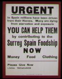 A white poster with black text and a black border. Text reads: "URGENT / In Spain millions have been driven from their Homes. Many are dying from starvation and exposure. YOU CAN HELP THEM by contributing to the Surrey Spain Foodship NOW / Money, Food, Clothing / Please Give Now, LOCAL TREASURER" This poster was printed by Reigate printing works in Reigate and was part of a campaign to send aid to Spanish Republicans during the Spanish Civil War.