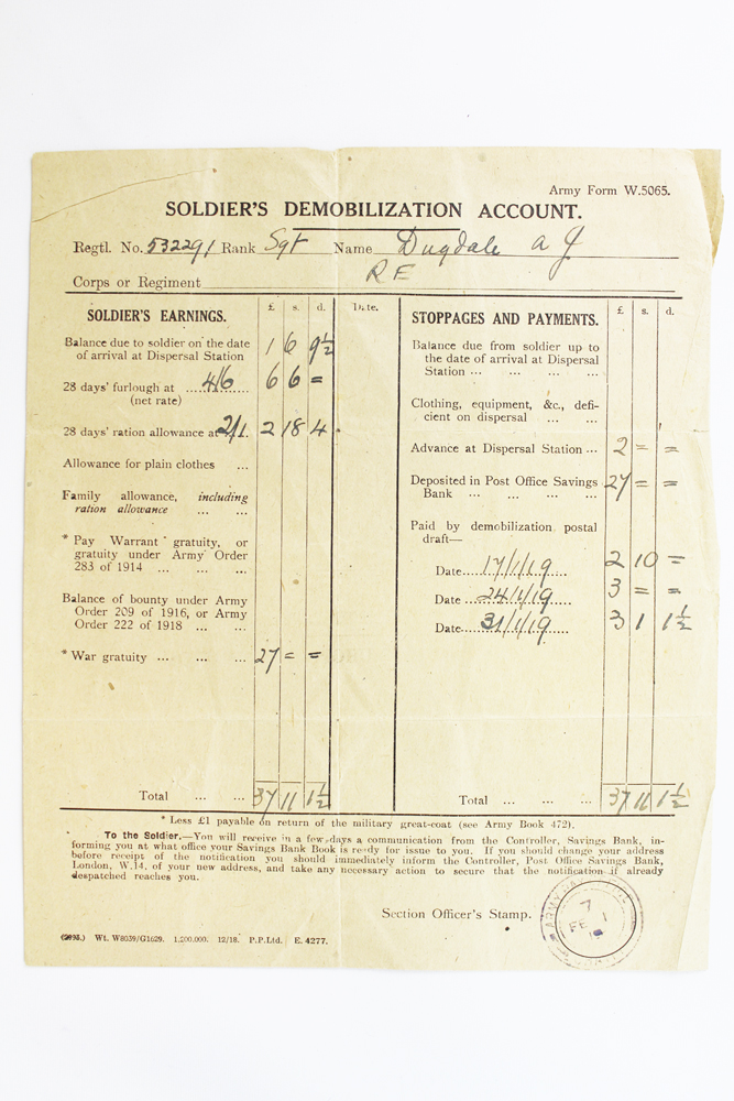 Dugdale finished the war in Germany as a prisoner of war after being captured during the Balle of Cambrai in November 1917. In November 1918 he was moved to a hosital in Cologne to be treated for an influenza. His demobilization account is from February 1919.