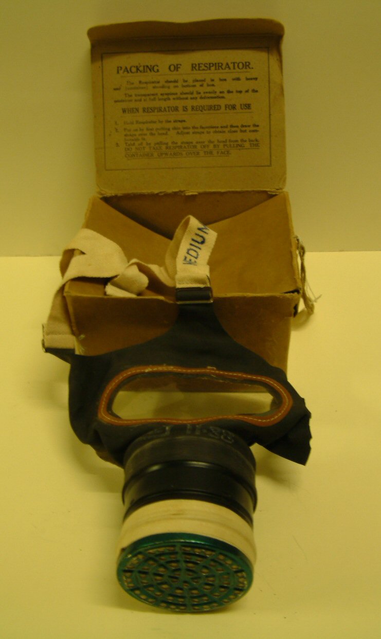 Gas masks, worn to protect against the inhalation of deadly gas, came in a wide range of shapes and sizes in World War II. Infants had a one-piece mask that covered the whole body. Young children took quite happily to the 'Mickey Mouse' gas masks. Older children and adults had a simpler form, made of rubber, webbing and a one-piece acetate visor which had a habit of cracking. People hated them. However, fears were ill-founded. German bombers dropped no gas bombs. Originating in the 1920s, various pessimistic theories of massive startegic bombing involving gas, had done much to influence civil defence planning. There were fears that entire British towns and their citizens would be wiped out in a matter of hours. This gas mask, with acetate visor, is the type for older children and adults.