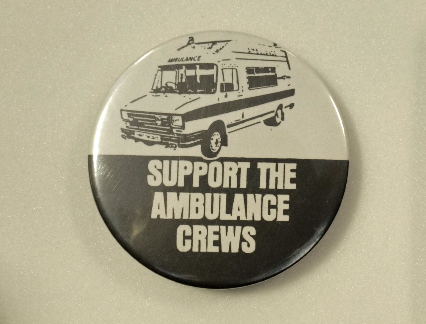 Circular white and black badge, "Support the Ambulance Crews" with an illustration of an ambulance at the top.