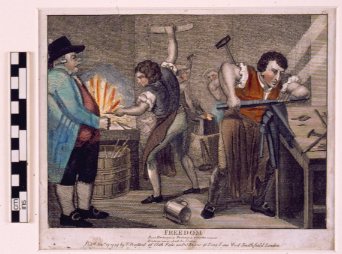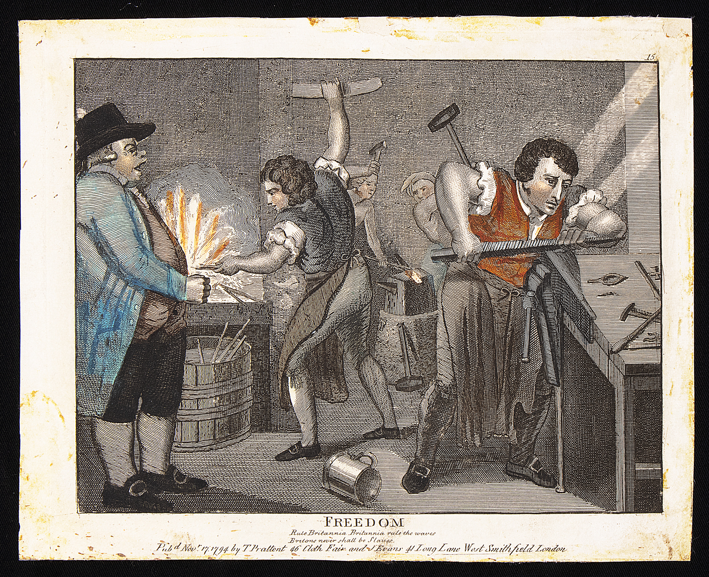 There seems to be an ironic point being made in this poitical print of 1794: playing on the refrain of the English national anthem 'Rule Britannia', British naval power might 'rule the waves' and 'Britons never shall be slaves', but there is little freedom for its citizens in the workshop. Here skilled metal workers, perhaps tinplate workers, are being hard-pressed by their workshop owner, who appears to be bawling at the men. The words of 'Rule Britannia' the national were composed by the poet James Thomson and were put to music around 1740 by Thomas Augustus Arne. In 1794 Britain was still at war with France. However, it was only with the Nelson's victory over the French at the Battle of Trafalgar in 1805 that the British navy was to 'rule the waves'. This was immensely important for Britain as it was the world's leading manufacturing and trading nation.