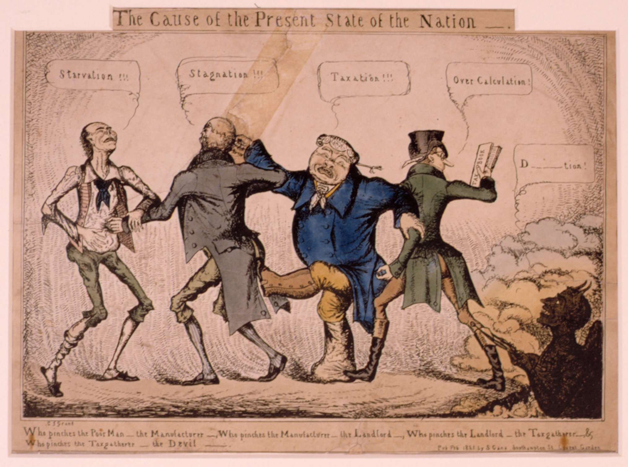 shows the poor man with speech bubble saying Starvation, The Manufacturer saying Stagnation, The Landlord saying Taxation, The Tax Gatherer saying Over Calculation, and The Devil saying D......tion
