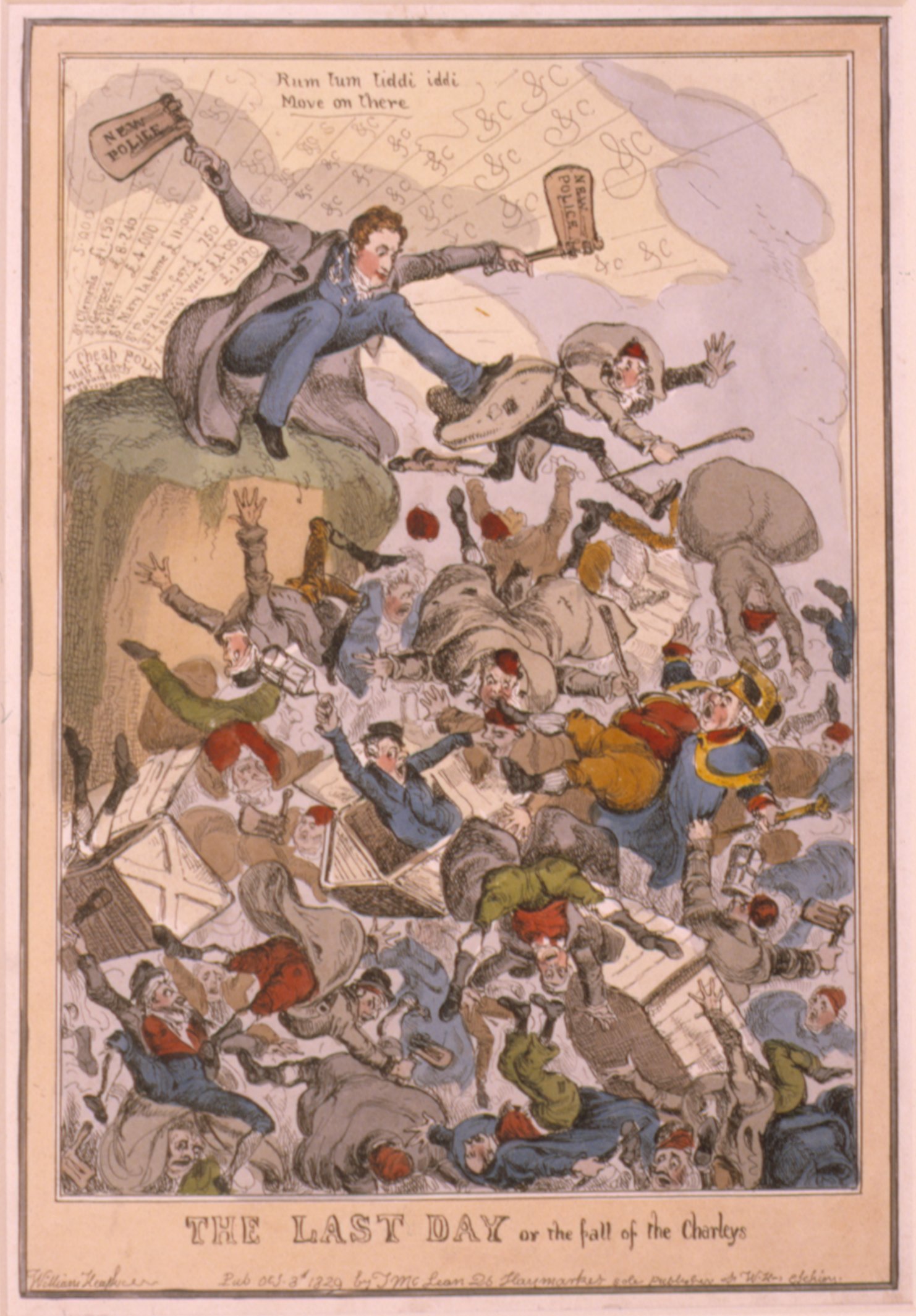 "print & colour & political & satirical & The Last Day Or The Fall Of The Charleys & Introduction of the New Police "The Peelers" & Robert Peel & 1829 & mounted" [NMLH.1993.372.47]