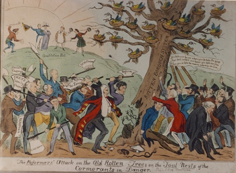 OSP Note: This pro-reform cartoon shows a tree, which represents the rotten boroughs, being chopped down. The names in the tree are those of the rotten boroughs. It illustrates the Reform Crisis.