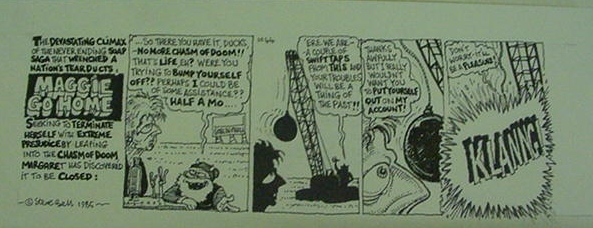 "cartoon & 21 strips, five mounted in one mount & 'Maggie Go Home' series & by Steve Bell & 1985" [NMLH.1993.412]