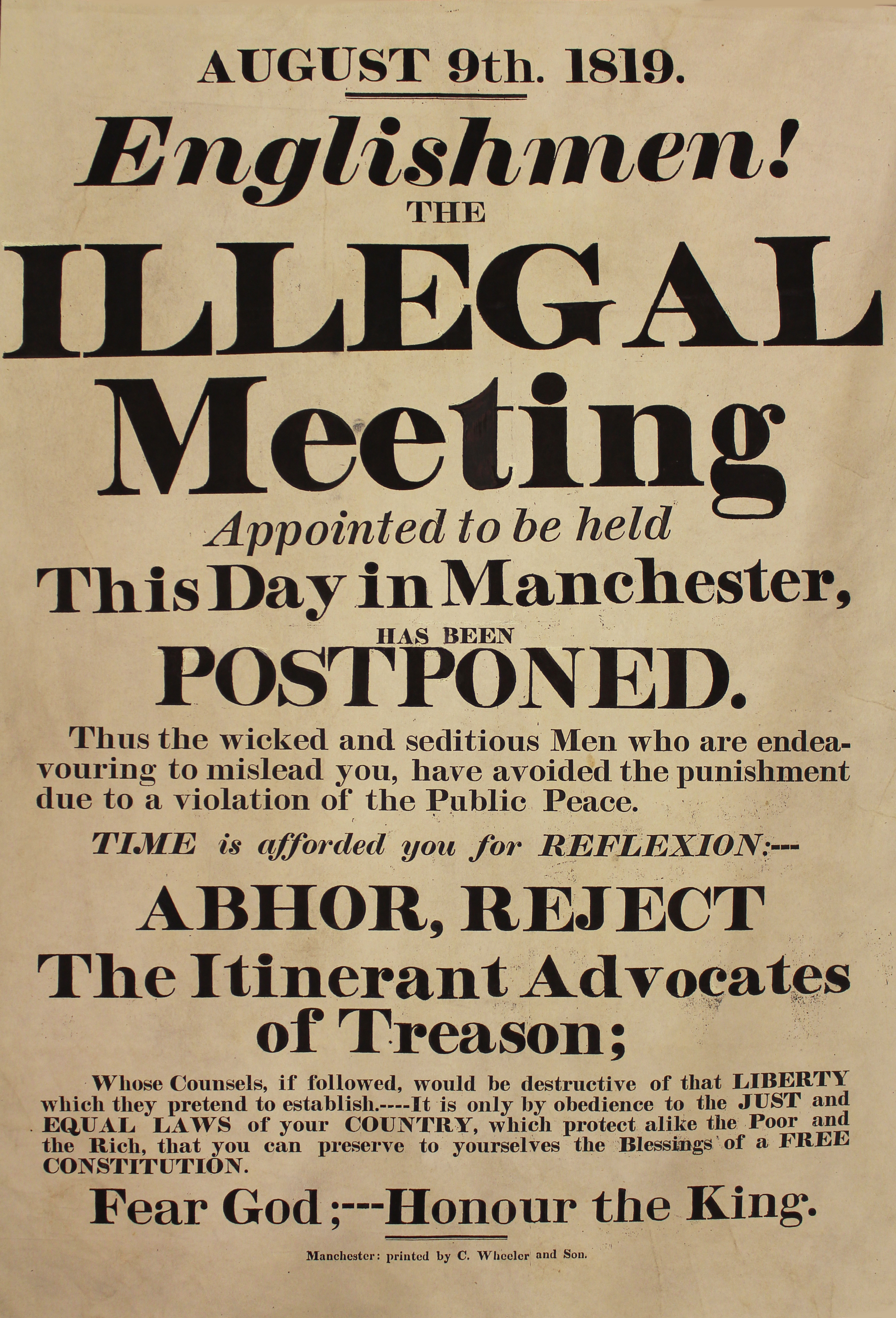 'August 9th 1819. Englishmen! The illegal meeting appointed to be held this day in Manchester, has been postponed. Abhor, reject the itinerant advocates of Treason.'