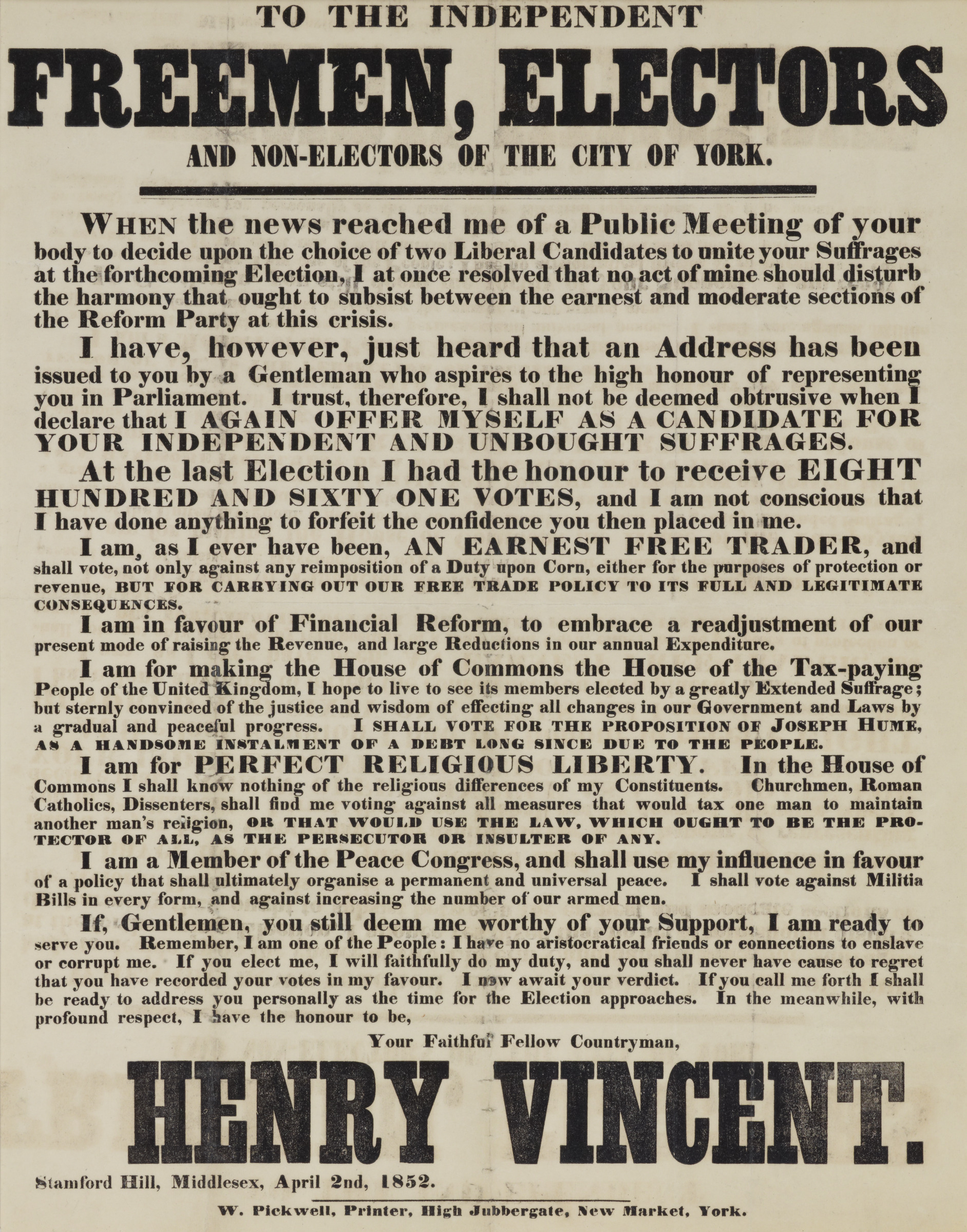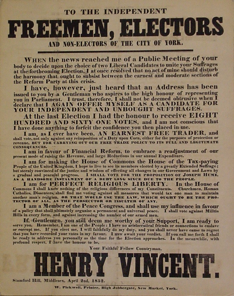 TO THE INDEPENDENT FREEMEN ELECTORS AND NON-ELECTORS OFTHE CITY OF YORK...HENRY VINCENT...1852