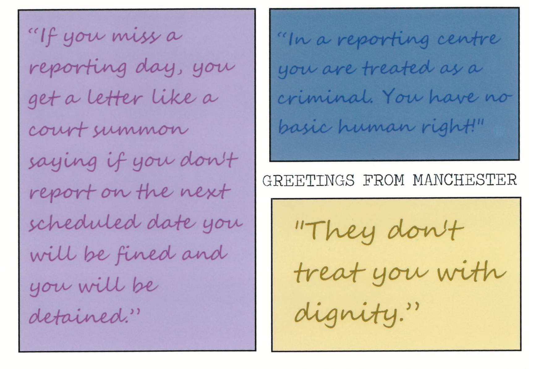 Artist Sophia Gardiner joined up with RAPAR on a project called 'Uncredibles: Greetings from Manchester' to make these postcards. Gardiner worked with two RAPAR members who contributed quotes from their Home Office refusal letters along with statements about how they are treated in the asylum system. These were produced into postcards as a satirical take on the traditional tourist postcards that try to promote the city as a beautiful and welcoming place.