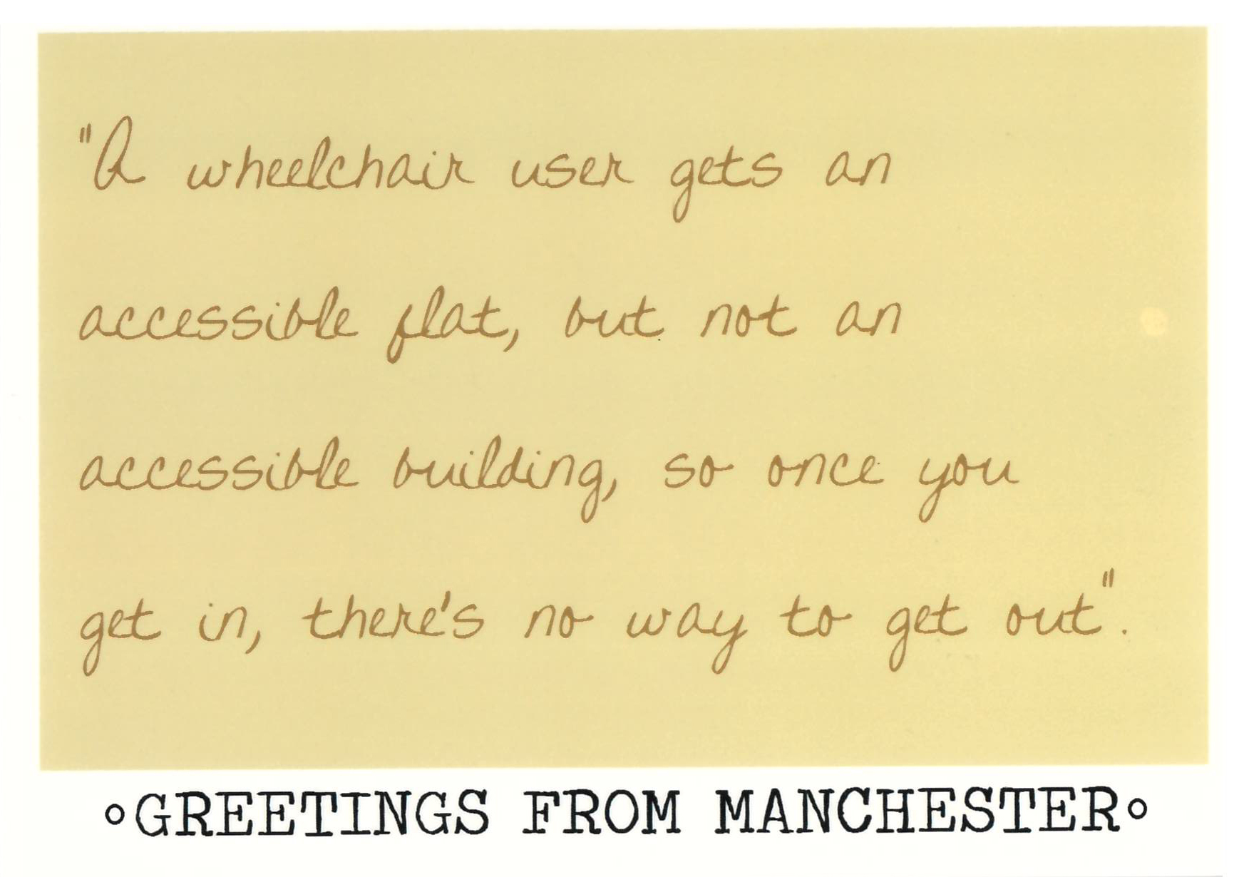 Artist Sophia Gardiner joined up with RAPAR on a project called 'Uncredibles: Greetings from Manchester' to make these postcards. Gardiner worked with two RAPAR members who contributed quotes from their Home Office refusal letters along with statements about how they are treated in the asylum system. These were produced into postcards as a satirical take on the traditional tourist postcards that try to promote the city as a beautiful and welcoming place.