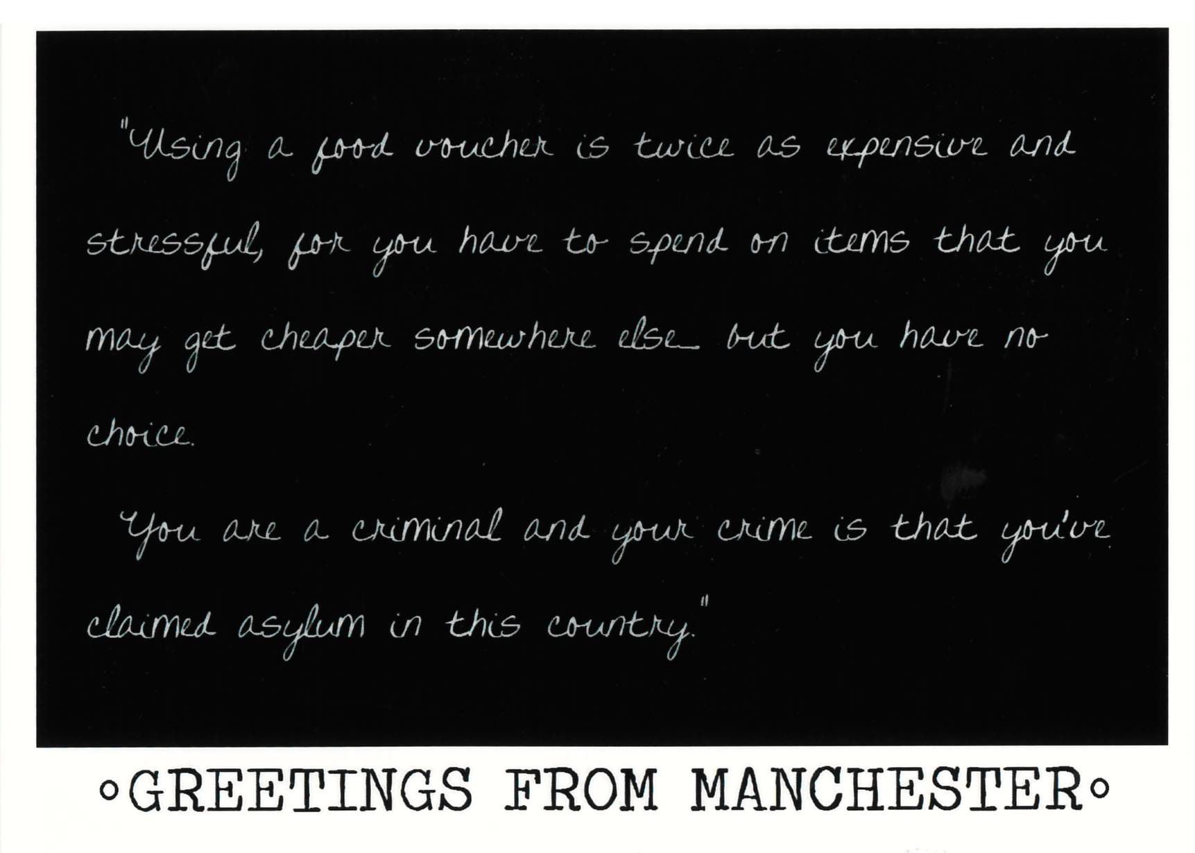 Artist Sophia Gardiner joined up with RAPAR on a project called 'Uncredibles: Greetings from Manchester' to make these postcards. Gardiner worked with two RAPAR members who contributed quotes from their Home Office refusal letters along with statements about how they are treated in the asylum system. These were produced into postcards as a satirical take on the traditional tourist postcards that try to promote the city as a beautiful and welcoming place.