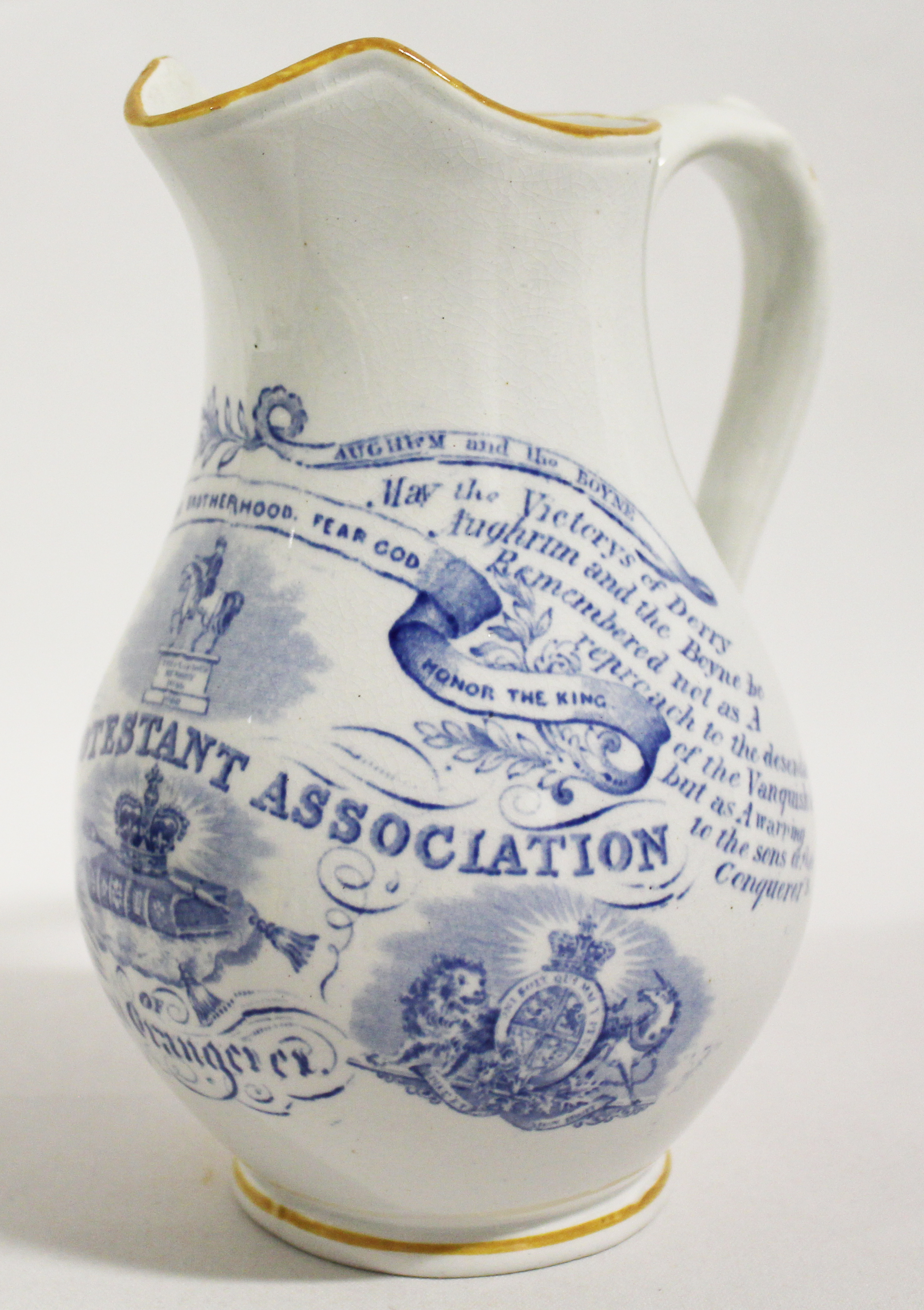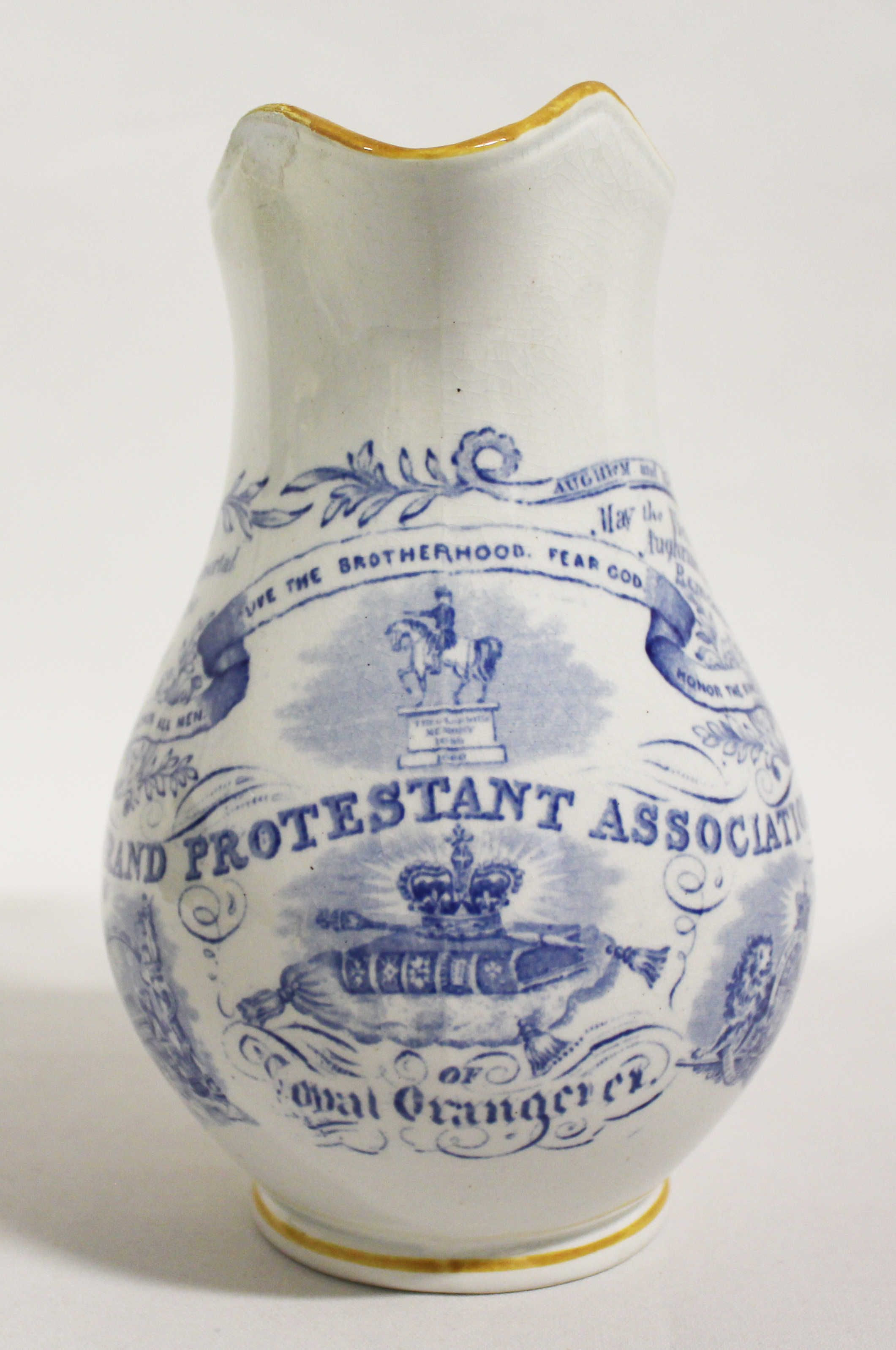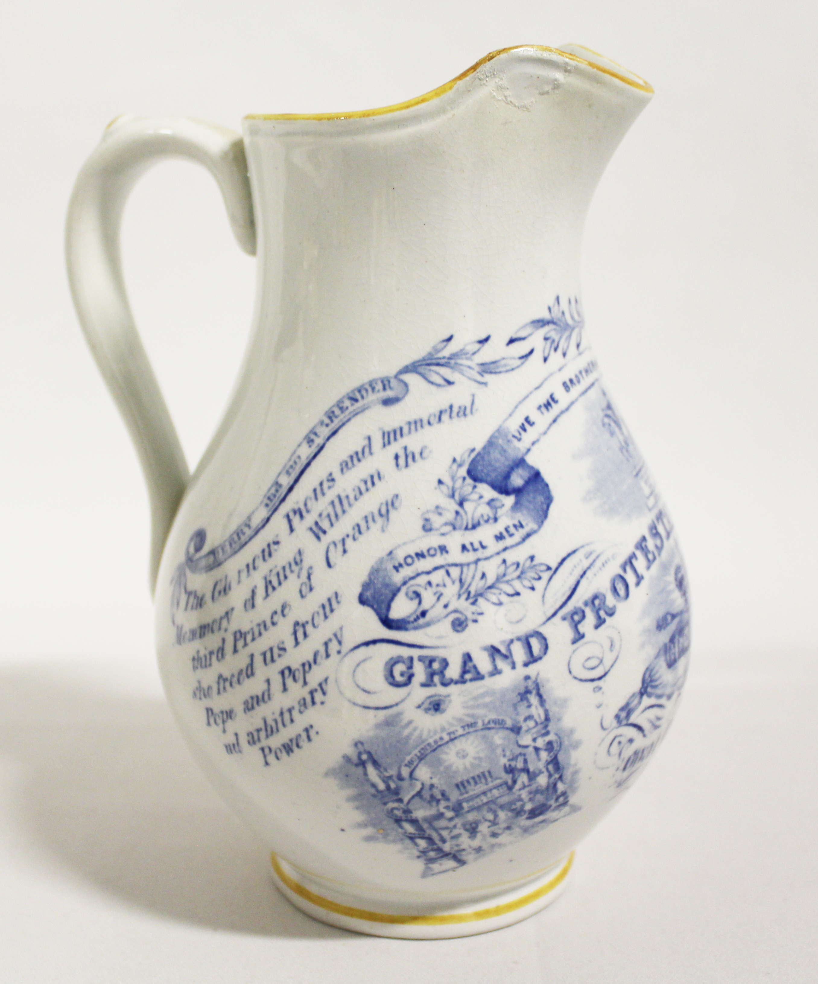 The jug reads: Honour All Men. Love the Brotherhood. Fear God. Honour the King. Grand Protestant Association of Royal Orangerer. The Glorious Pious and Immortal Memory of King William the third Prince of Orange who freed us from Pope and Popery and arbitary Power. May the Victories of Derry, Aughrim and the Boyne be Remembered not as A reproach to the descendents of the Vanquished but as A warning to the sons of the conquered.
