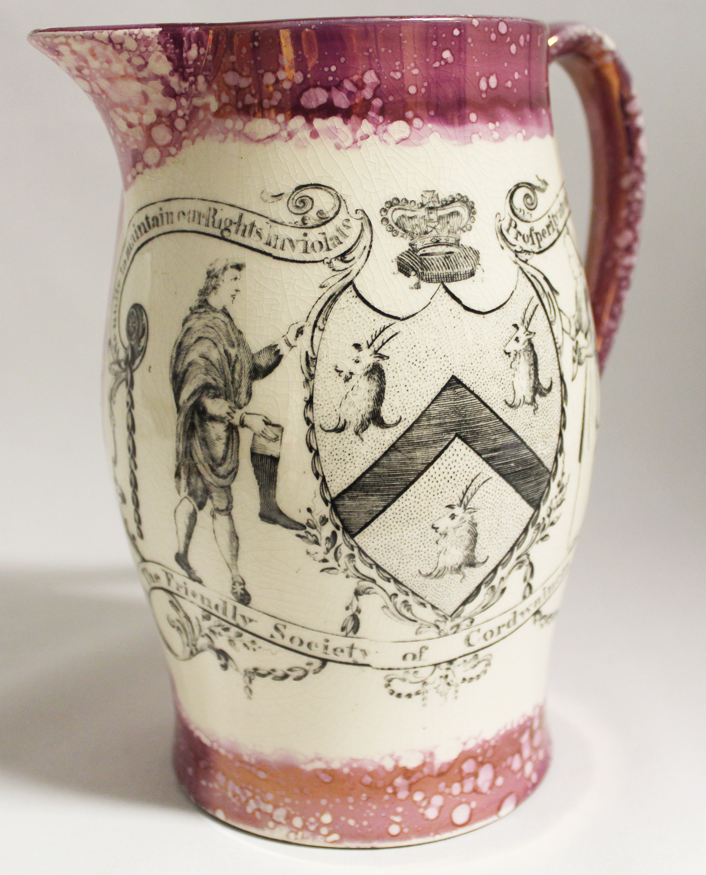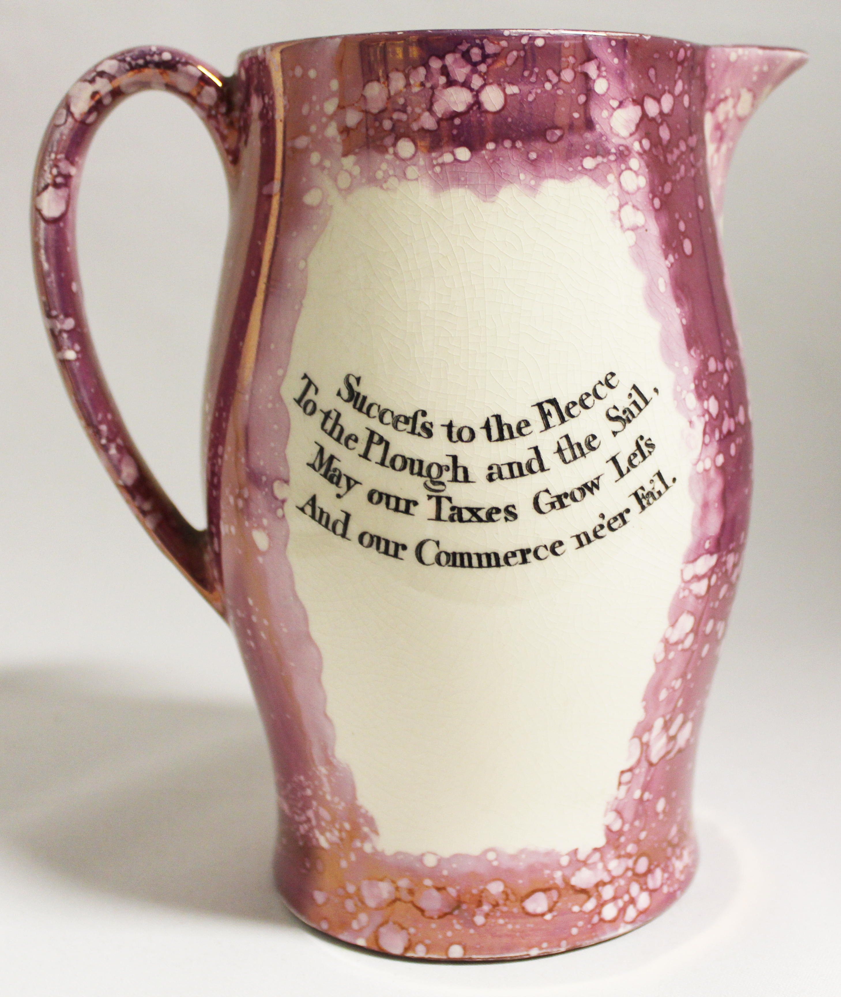 Jug reads: 'Success to the Fleece, To the Plough and the Sail, May our Taxes Grow Less, And our Commerce never fail'.