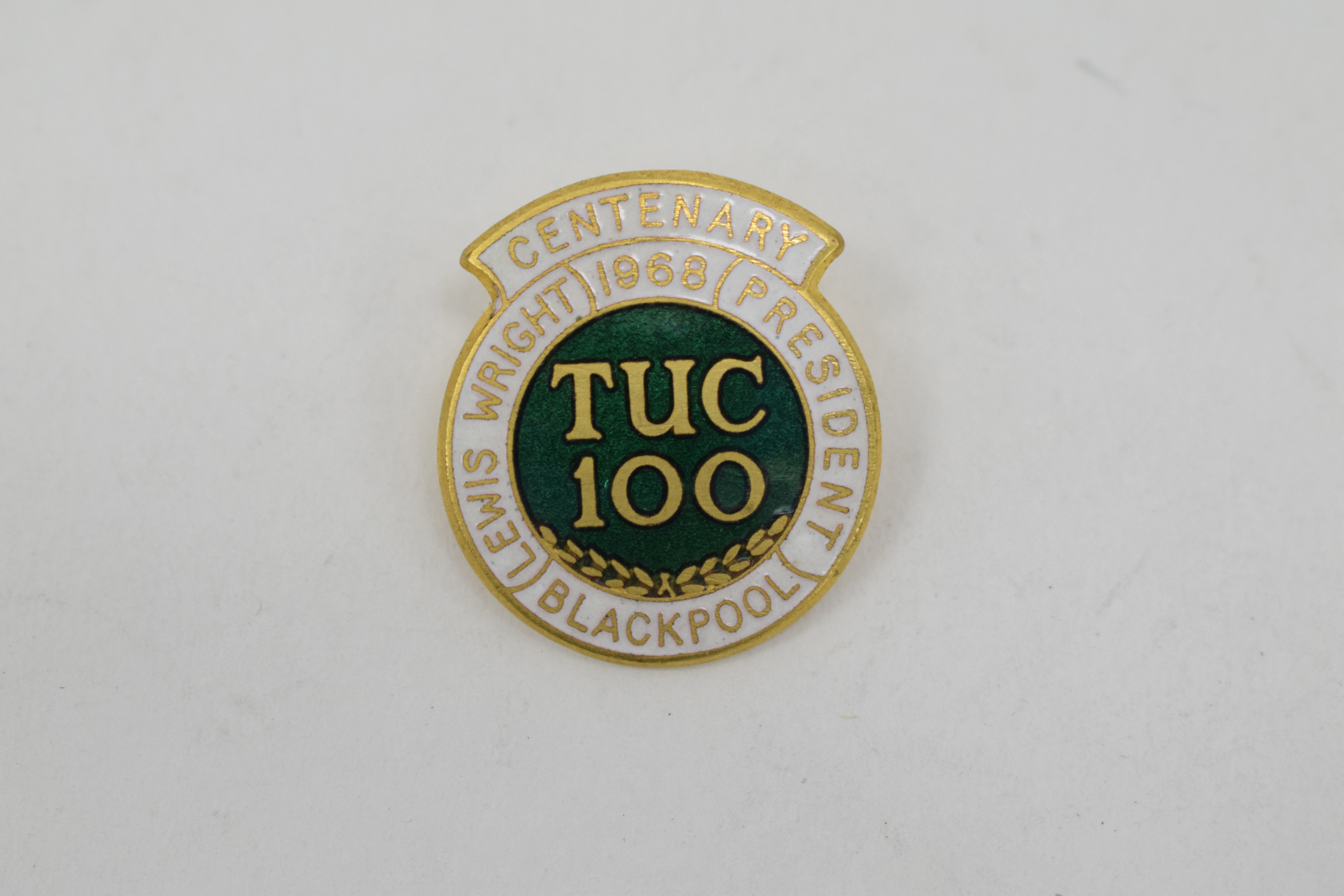 Circular TUC Trades Union Congress green and white badge, featuring gold printed text, reads 'CENTENARY TUC 100 1968 LEWIS WRIGHT PRESIDENT BLACKPOOL'