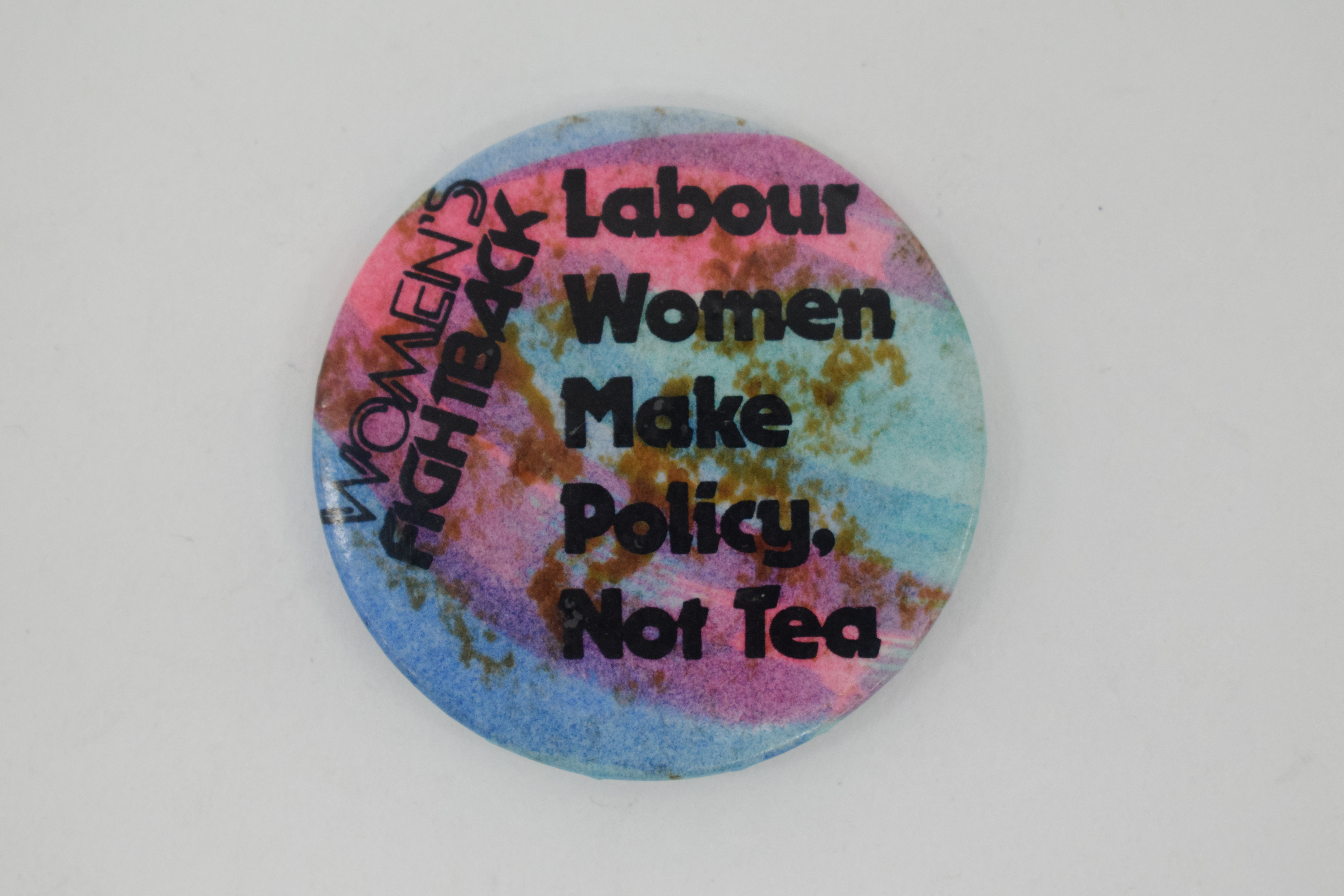 Multicoloured circular badge with "Womenâs Fight" and the slogan "Labour Women Make Policy, Not Tea" in black text.
