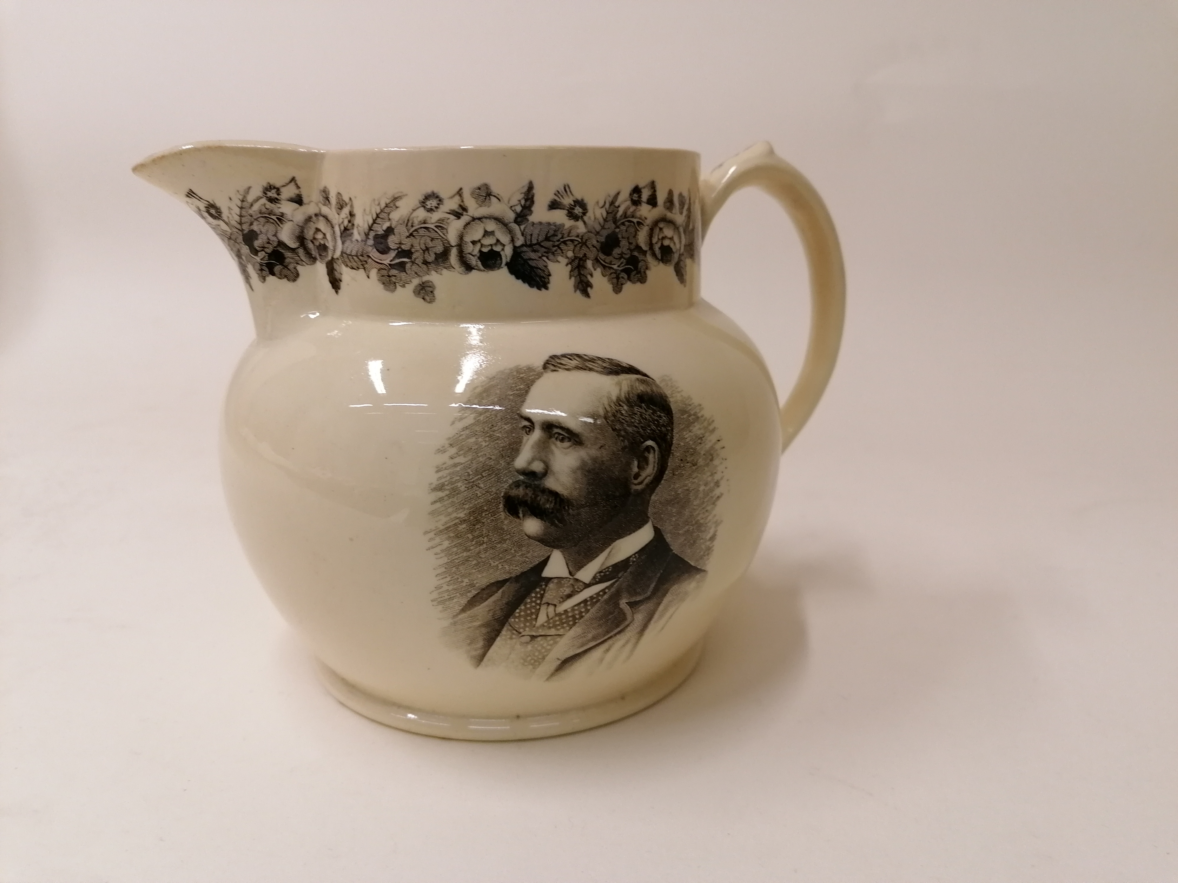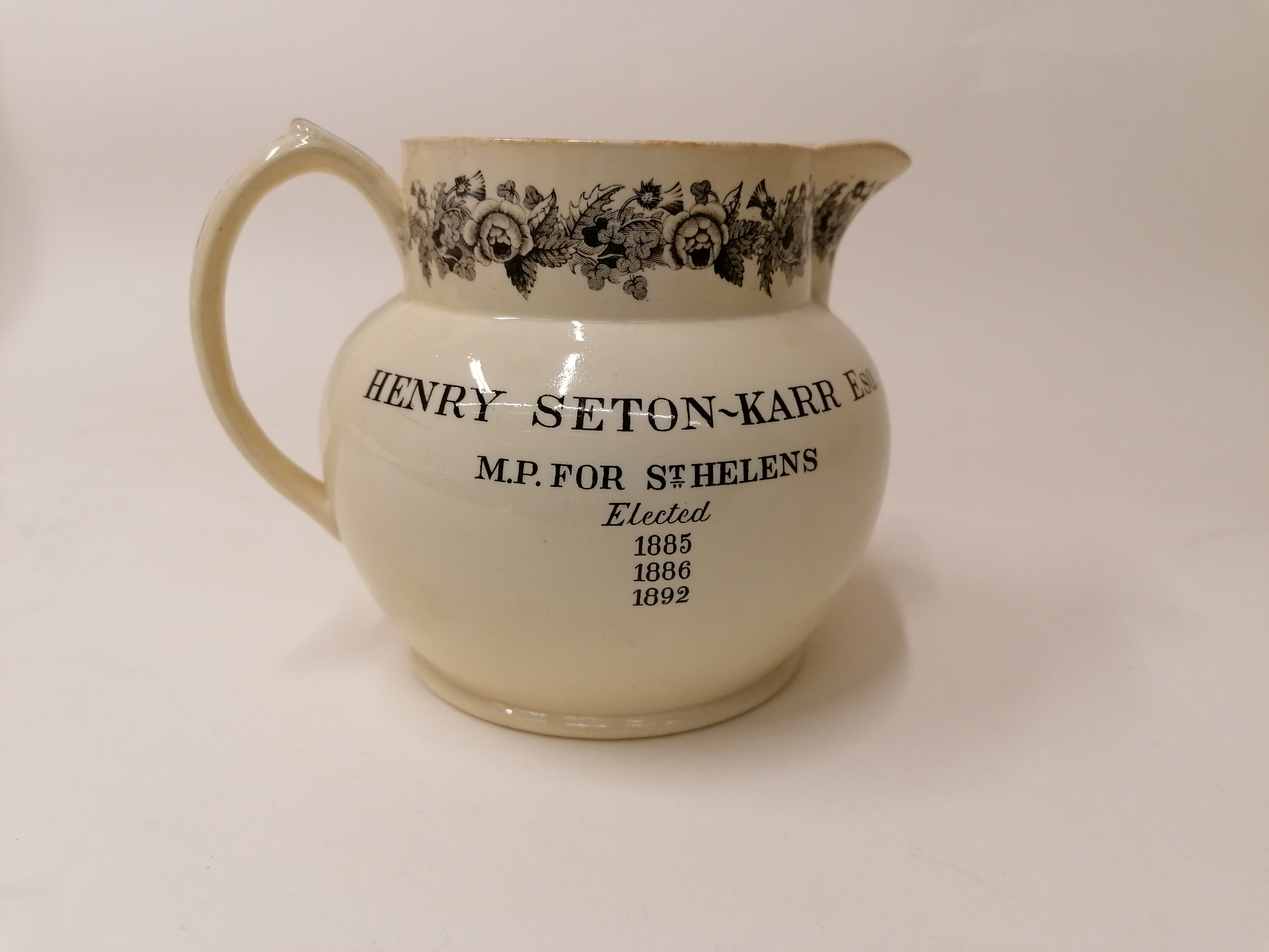 Jug embellished with black flowers around the top, dedicated to Henry Seton Karr MP for St Helens, Elected 1885, 1886 and 1892.