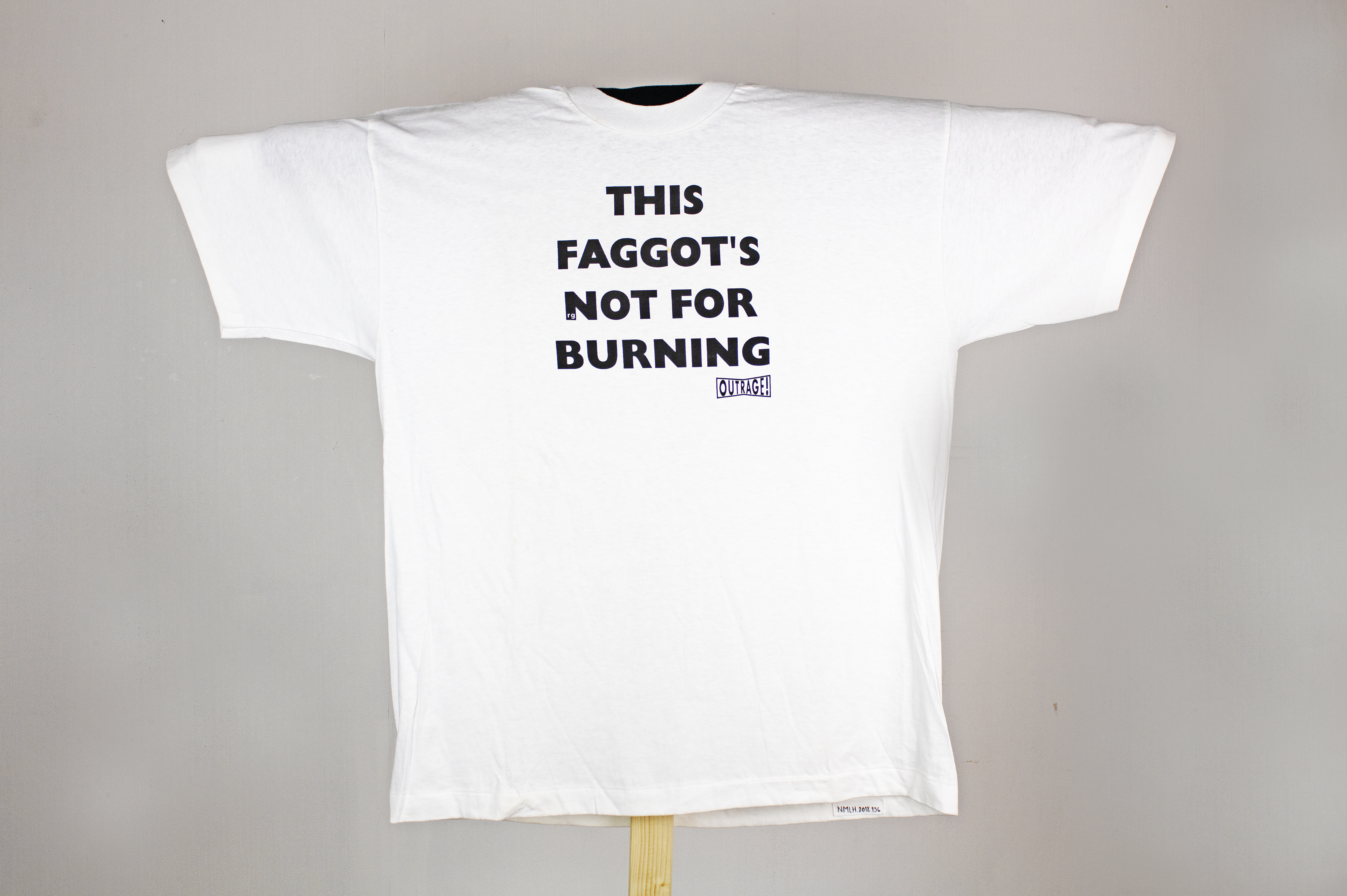 White T-Shirt, XL size, with black inscription âThis Faggotâs not for Burningâ and depicting OutRage! logo. This T-Shirt was produced in 1992 and worn by OutRage! activists on numerous protests over many years, including the 1992 âEquality now!â campaign of non-stop protests, from February to July 1992, which challenged each and every aspect of LGBT+ legal discrimination in the UK.