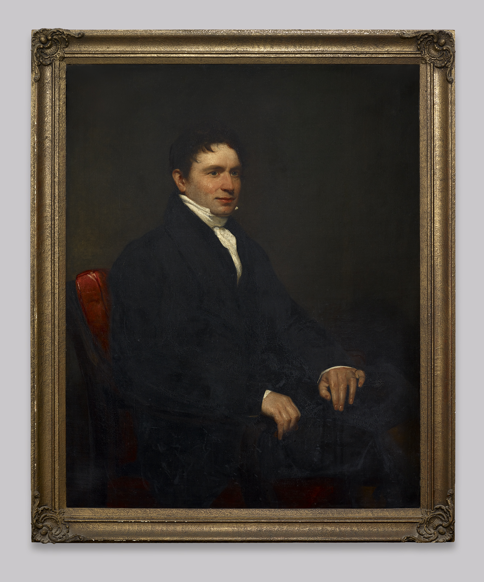 This portrait shows Birley, a local mill owner, seated on a red chair, and is thought to have been painted around 1819. A portrait such as this would have been a sign of Birley's wealth, social status and power. The portrait is framed in a gold frame, made from wood and plaster coating painted gold. The frame is likely of a later date, from 1850 to 1900.