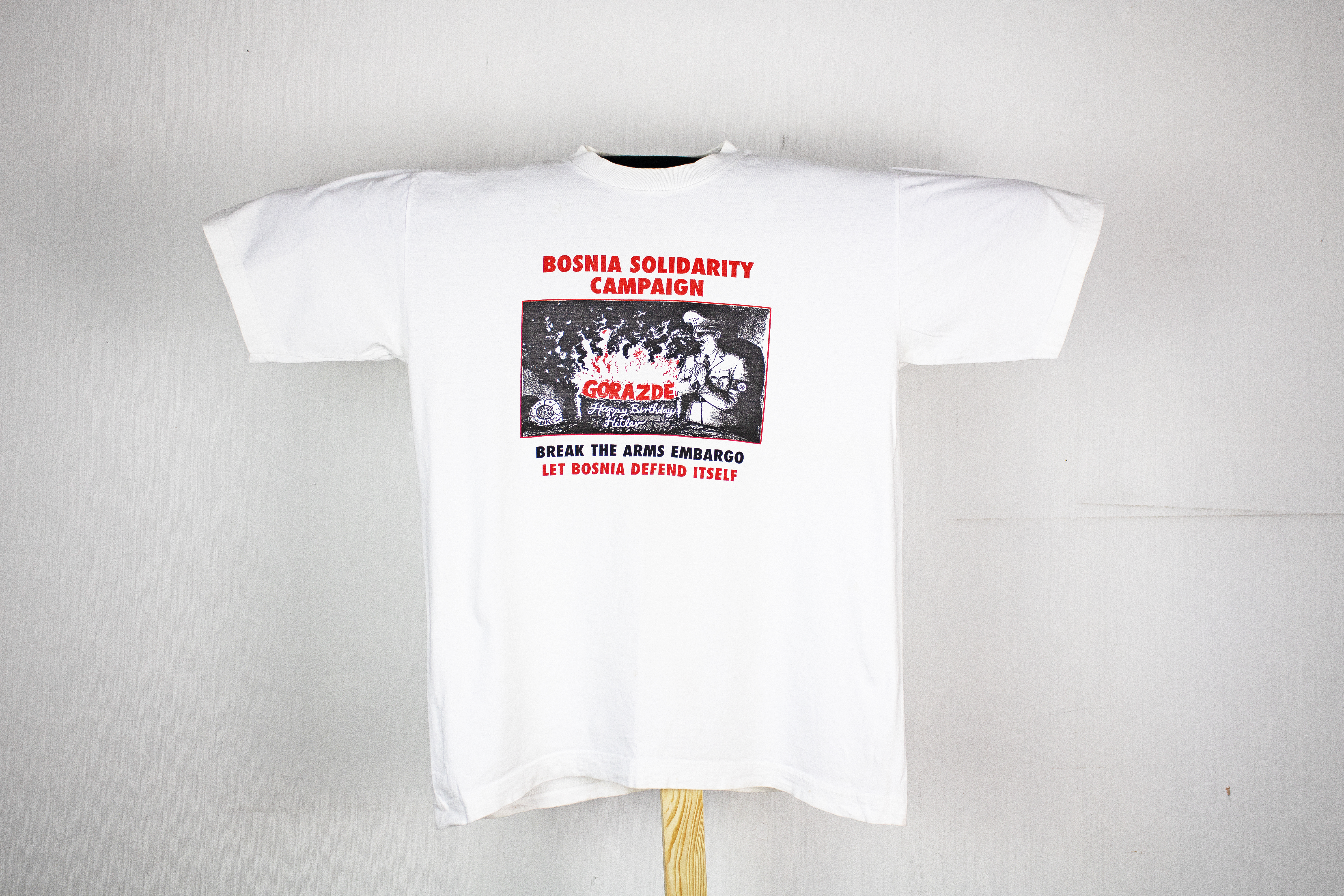 A white t-shirt reading "Break the Arms Embargo, let Bosnia defend itself" with a cartoon image reading "Happy Birthday Hitler"