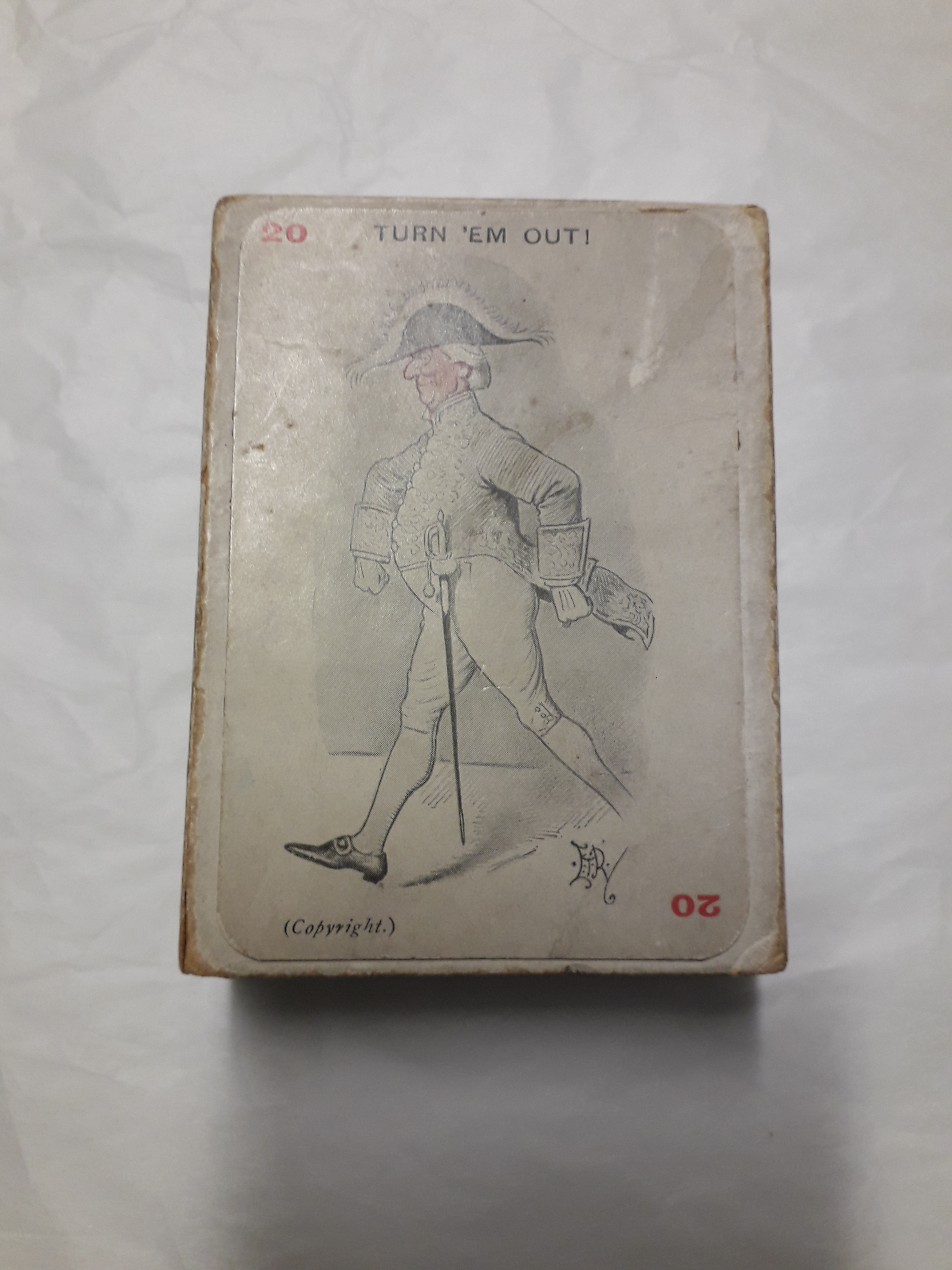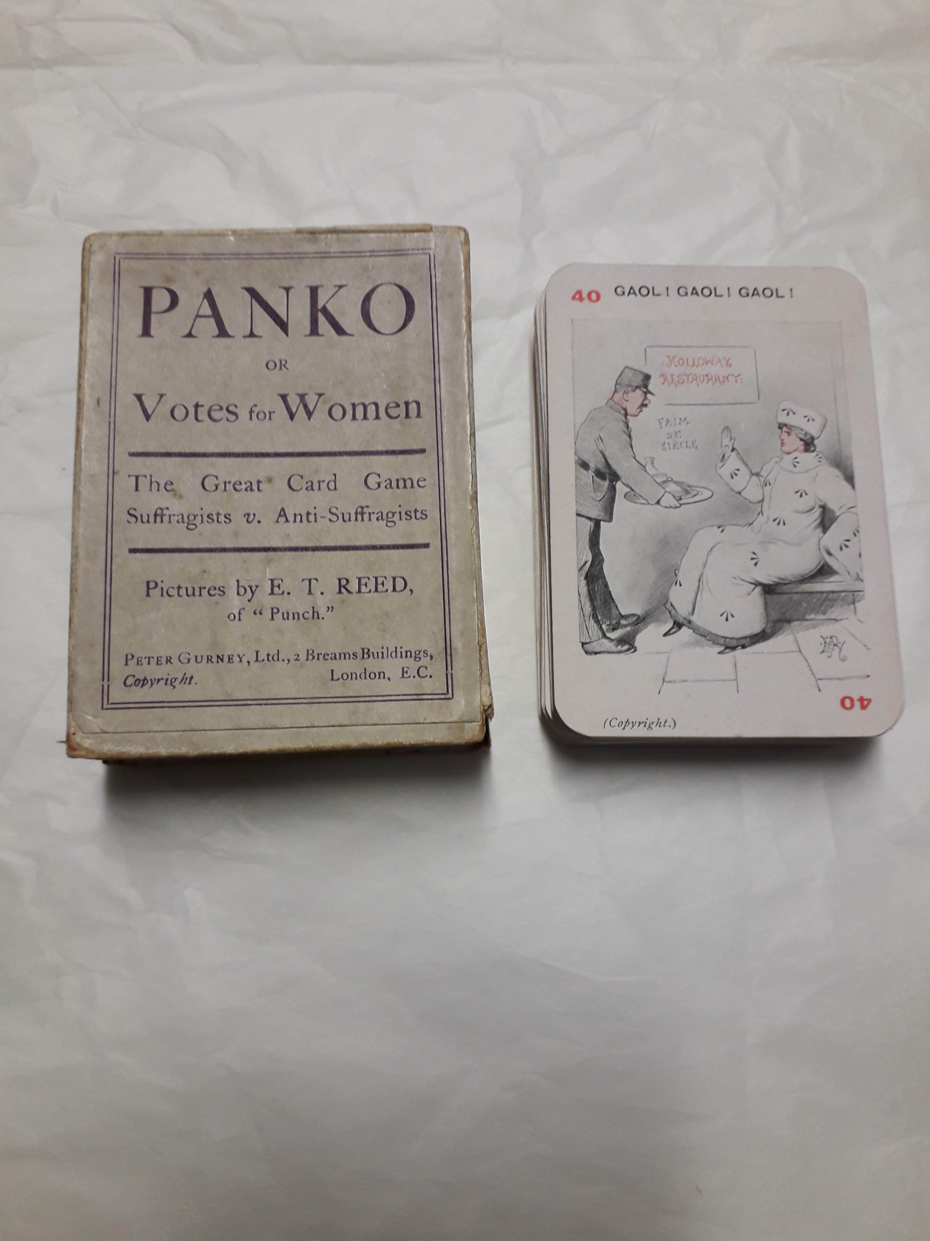 Each card features a purple and white design onthe reverse, and cartoons of political figures, policemen and suffragettes on the obverse. Cartoons designed by E.T. Reed of Punch magazine. The game was designed and sold by the Women's Social and Political Union to raise funds, as well as by independent merchants.