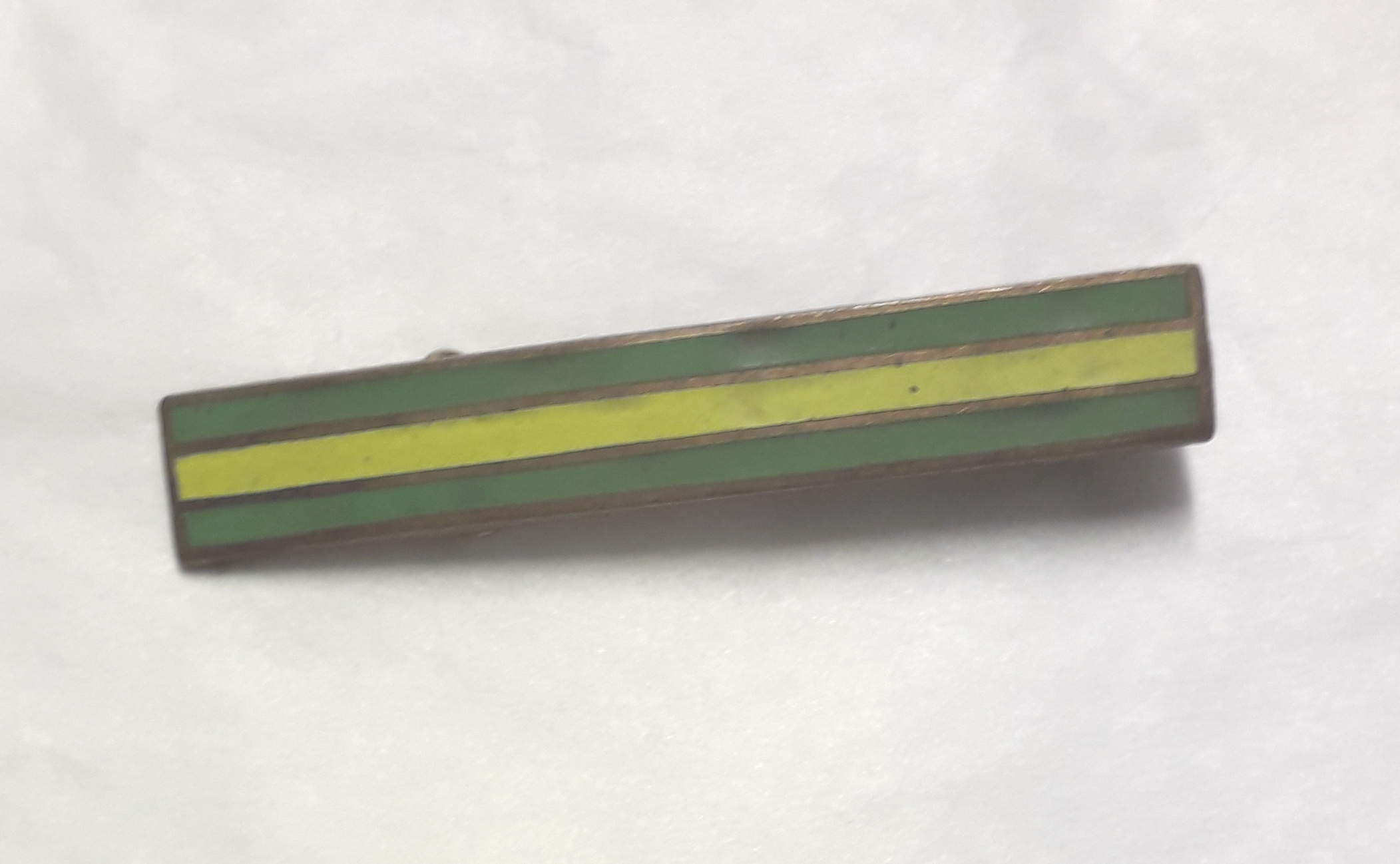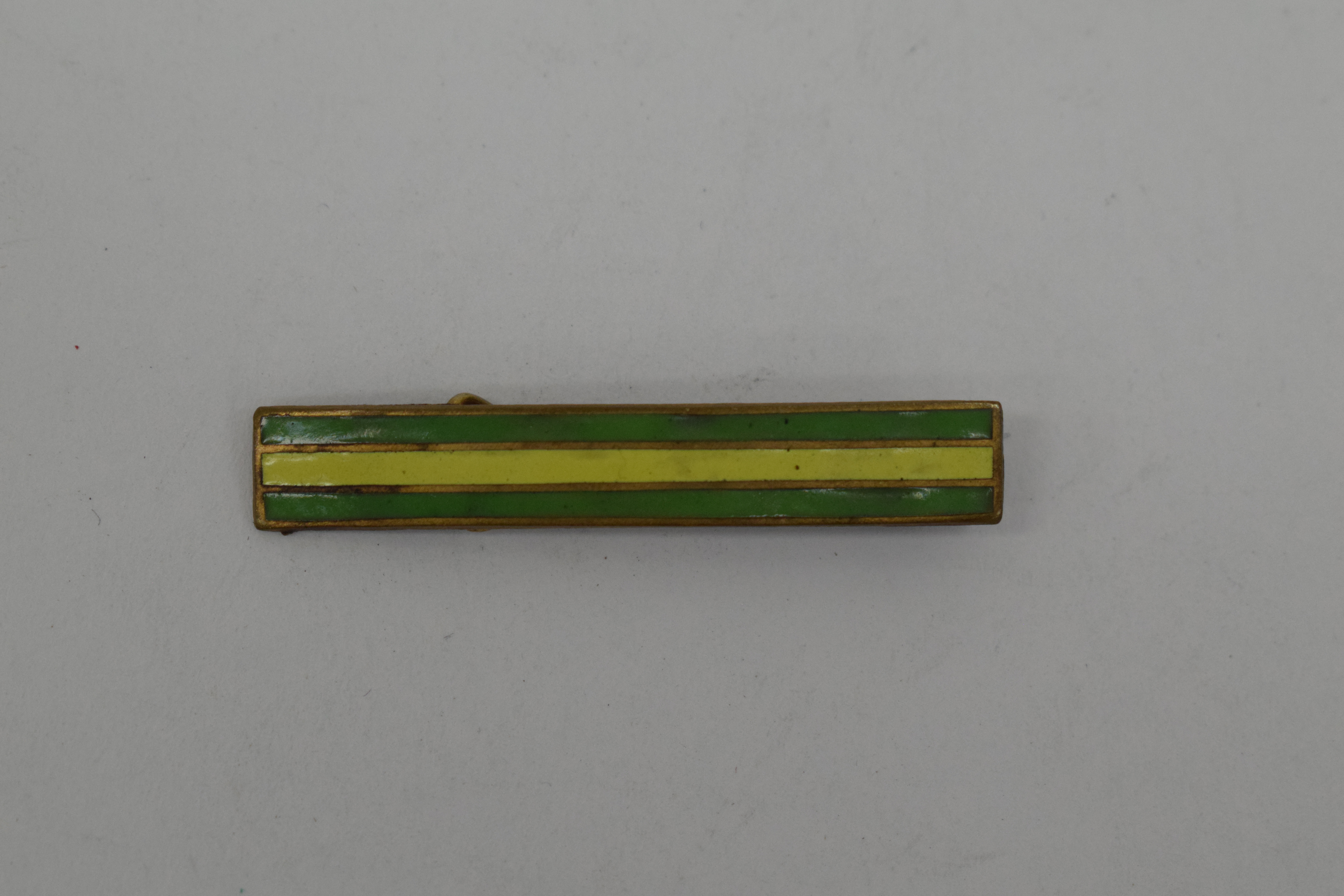 Rectangular shaped pin badge of the Women's Freedom League, with coloured stripes of green at the top and bottom, and yellow in the centre.
