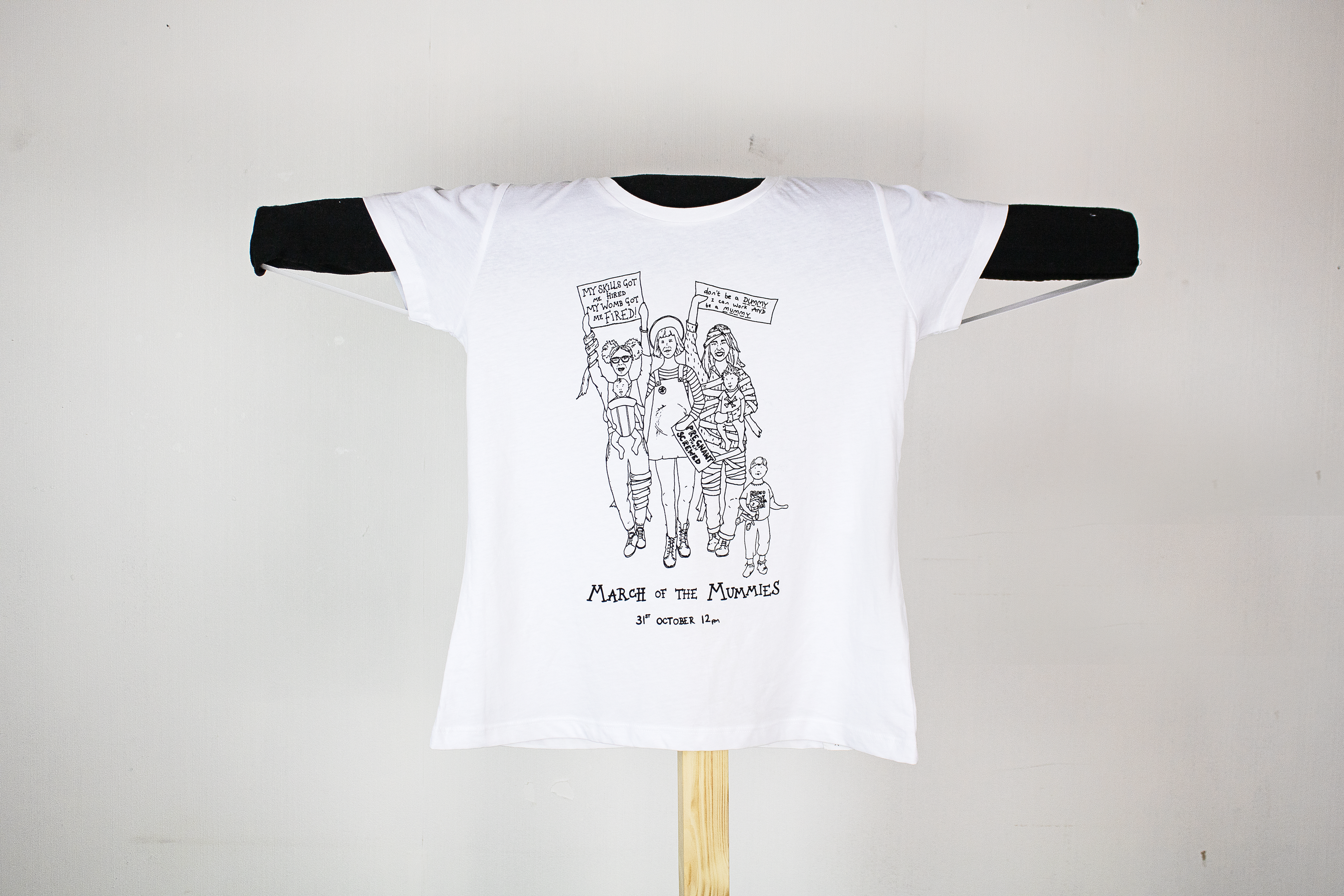White T-shirt with black design reading "March of the Mummies / 31st October 12pm" with illustrations of women marching with their children and holding signs reading "My skills got me hired, my womb got me fired!", "don't be a dummy, I can work and be a mummy!", and "Pregnant then screwed"