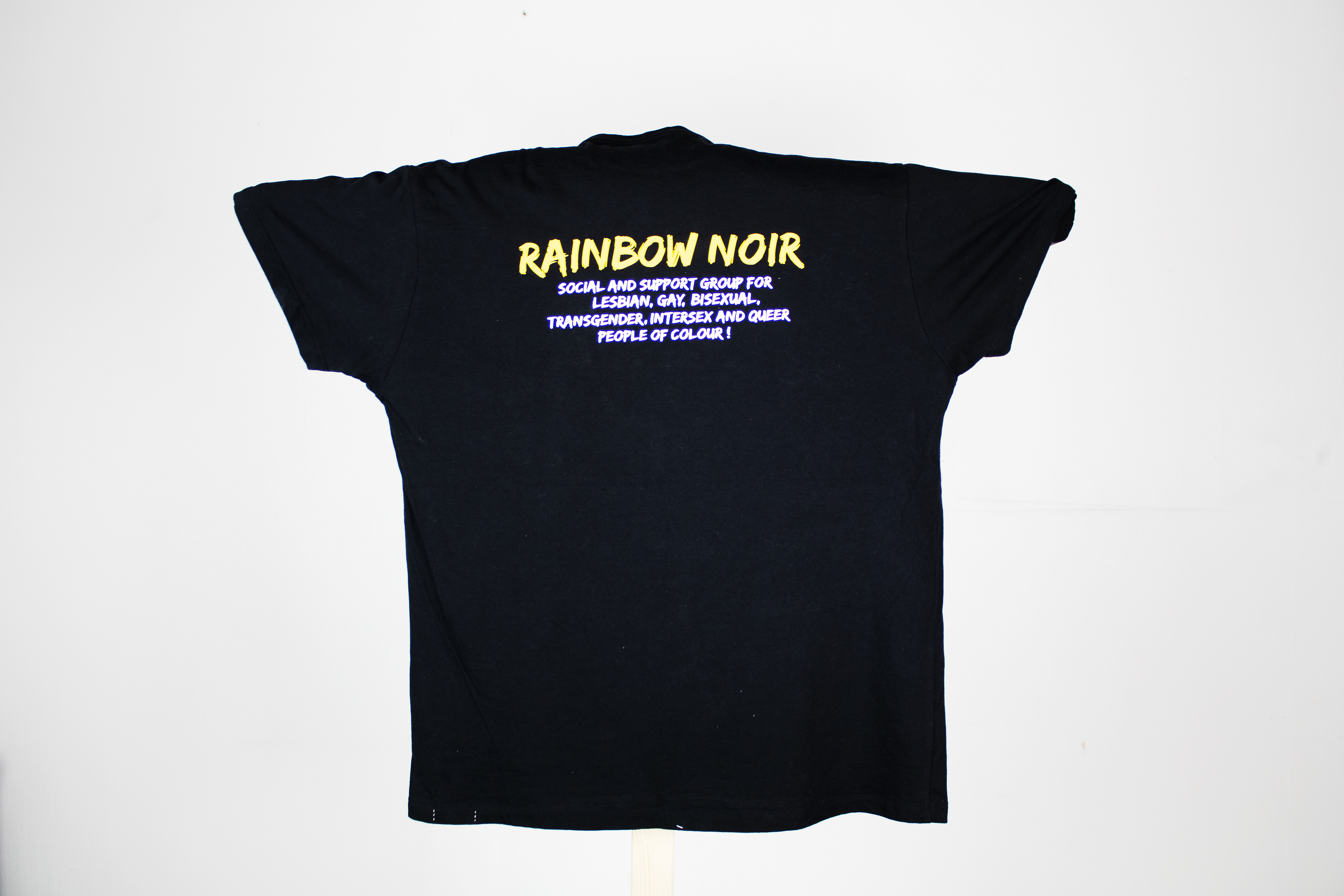 Black T-shirt , reading 'RAINBOW NOIR' in rainbow colour and white. Reverse features a description of the group, printed by Tom Quaye. Text reads: "Social and support group for Lesbian, Gay, Bisexual, Transgender, Intersex and Queer people of colour!"
