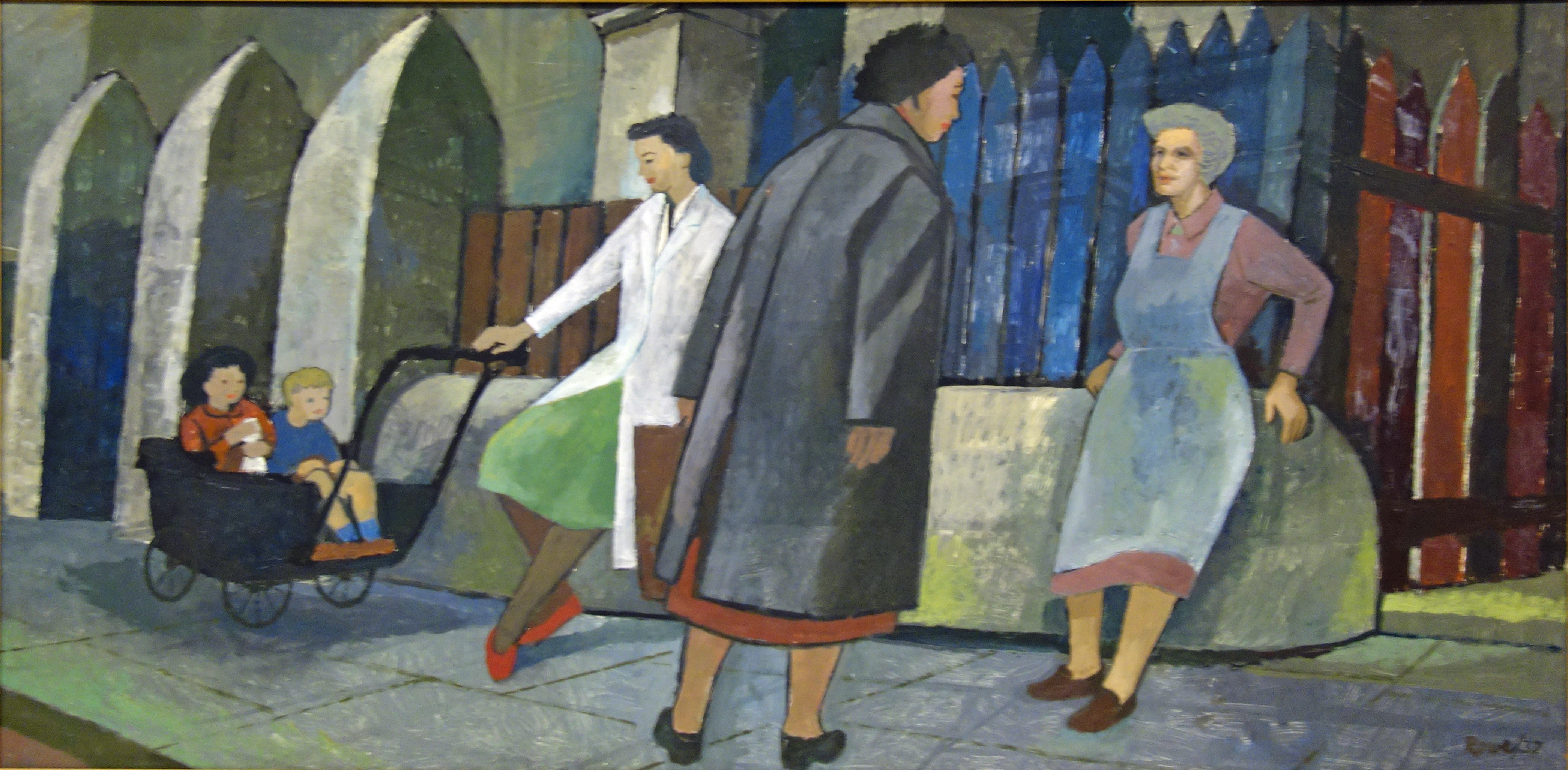 A women wears white clothes and is pushing a pram with two children, the women wears a black coat and is talking with another women who wears grey clothes.