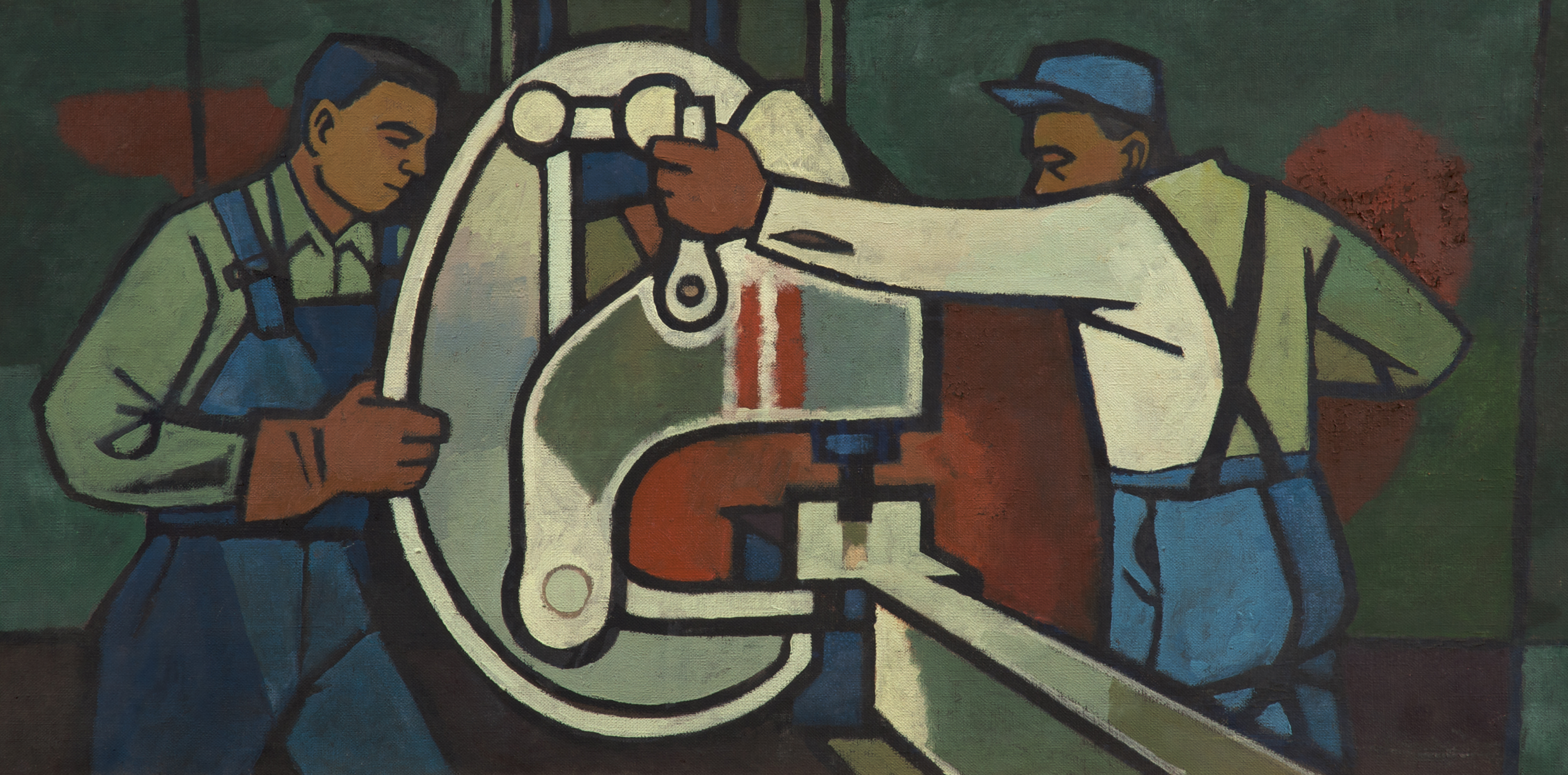 Oil painting on canvas, two workers, one worker wears green T-shirt and blue bib overall, and another worker wears white and green T-shirt, blue bib overall on the green background.