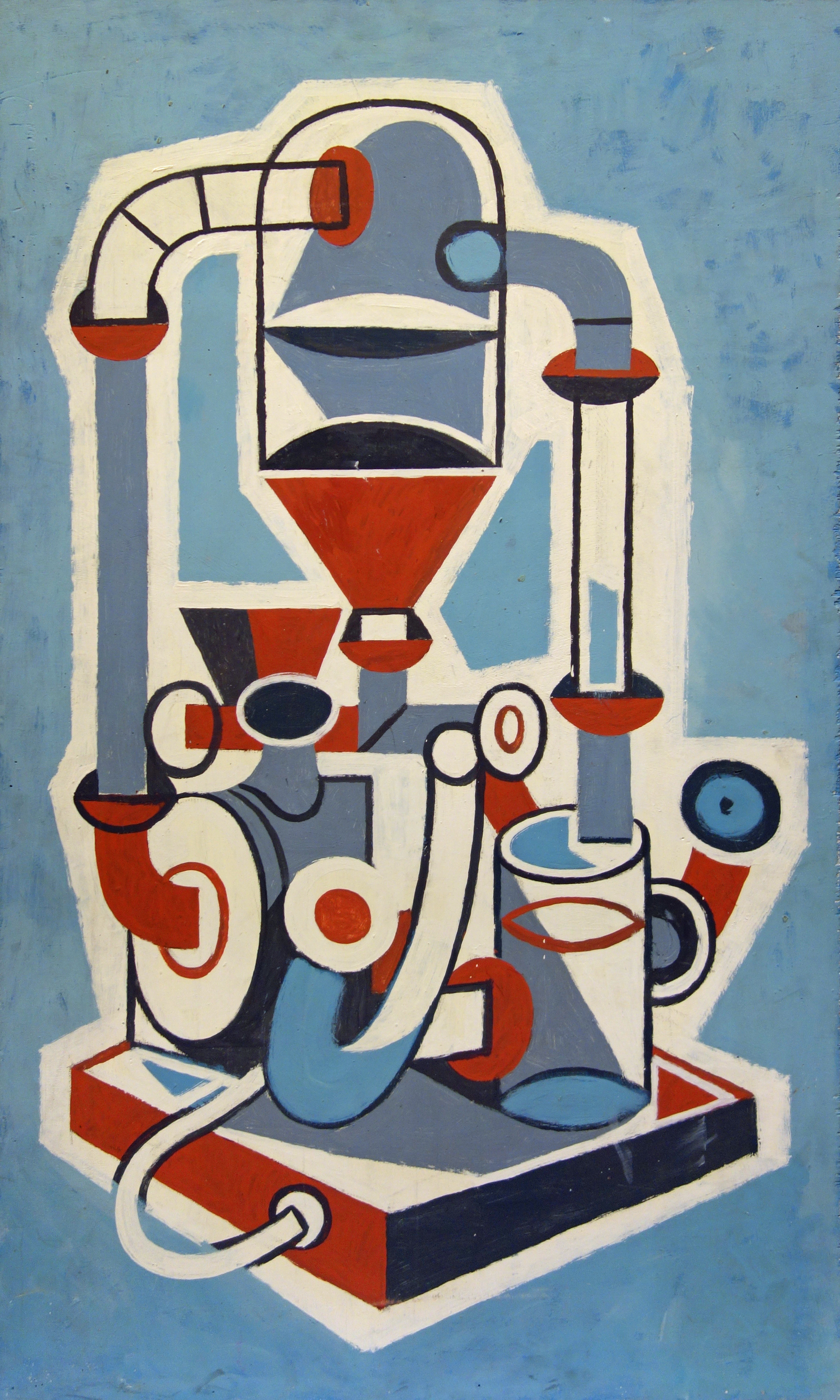 A machine with white, red and blue and grey on the blue and grey background.