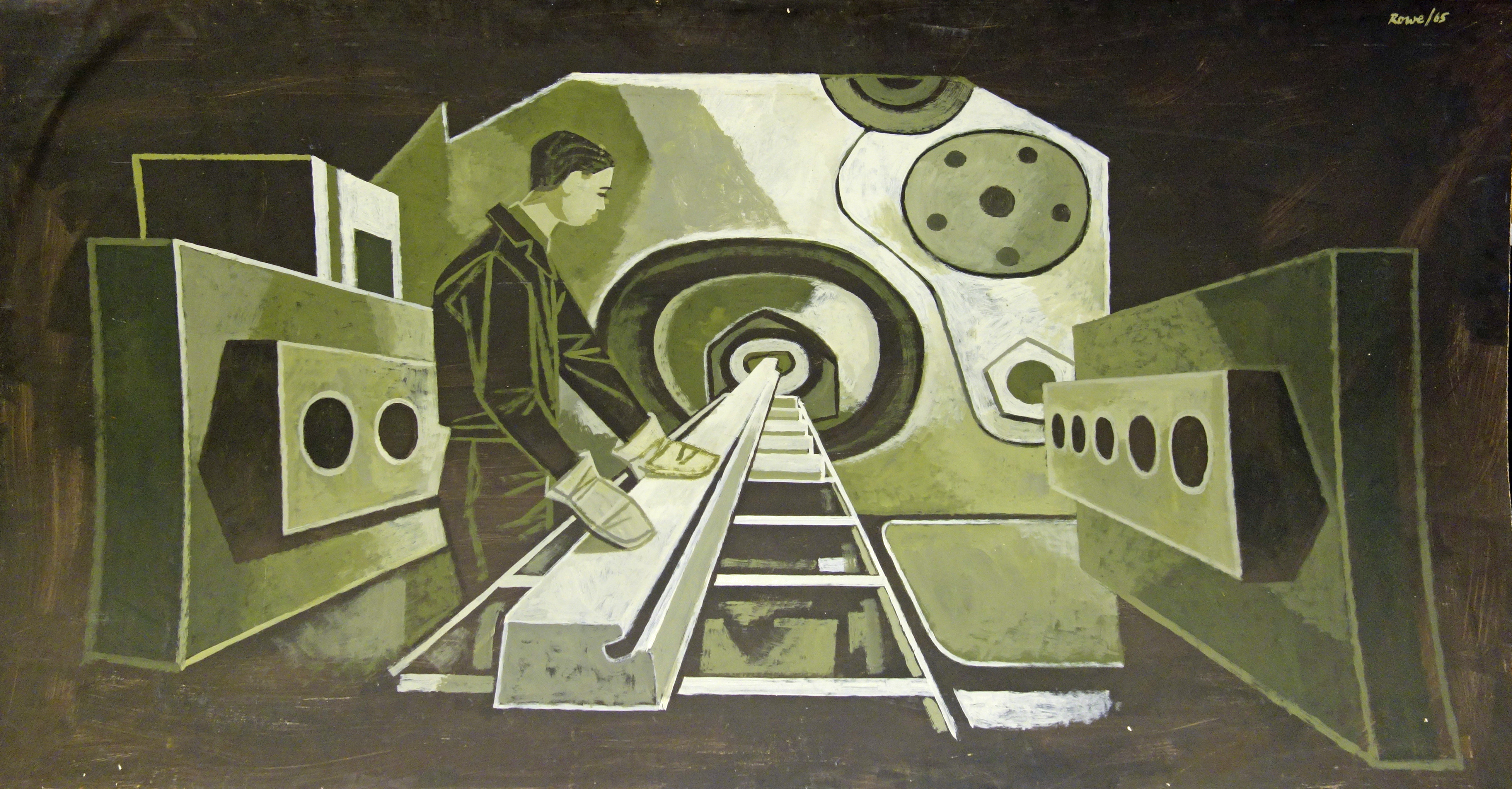 A male machine operator wearing black overalls and protective gloves stands within a machine with a central circular section and walls on the left and right sides. It is painted using sepia tone colours.